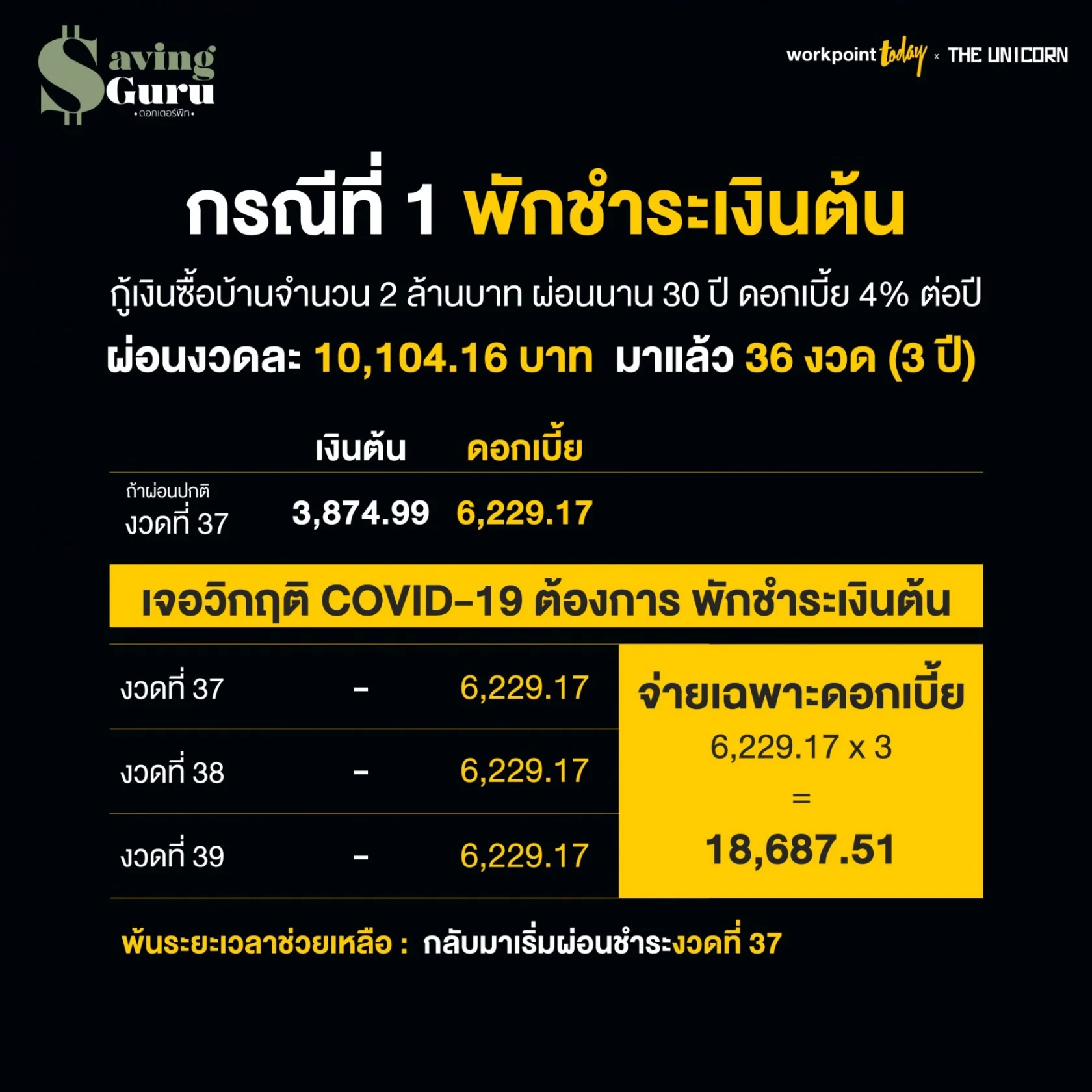 ดังนั้นการที่ นายอดออม จ่ายเฉพาะดอกเบี้ยเดือนละ 6,229.17 บาท มา 3 เดือน ยอดเงินต้นจึงยังคงเหลืออยู่ที่ 1,868,750.99 บาทเท่าเดิม เมื่อกลับมาชำระหนี้ตามปกติ ก็เหมือนการเริ่มชำระหนี้งวดที่ 37 ใหม่นั่นเอง