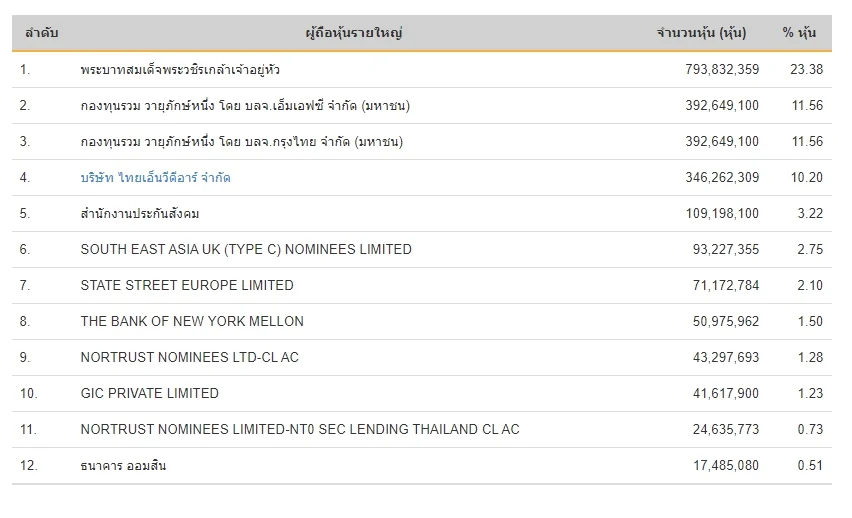 โดยโครงสร้างผู้ถือหุ้นรายใหญ่ 12 อันดับ ณ วันที่ 22 พ.ค. 2563 มีรายละเอียดดังนี้