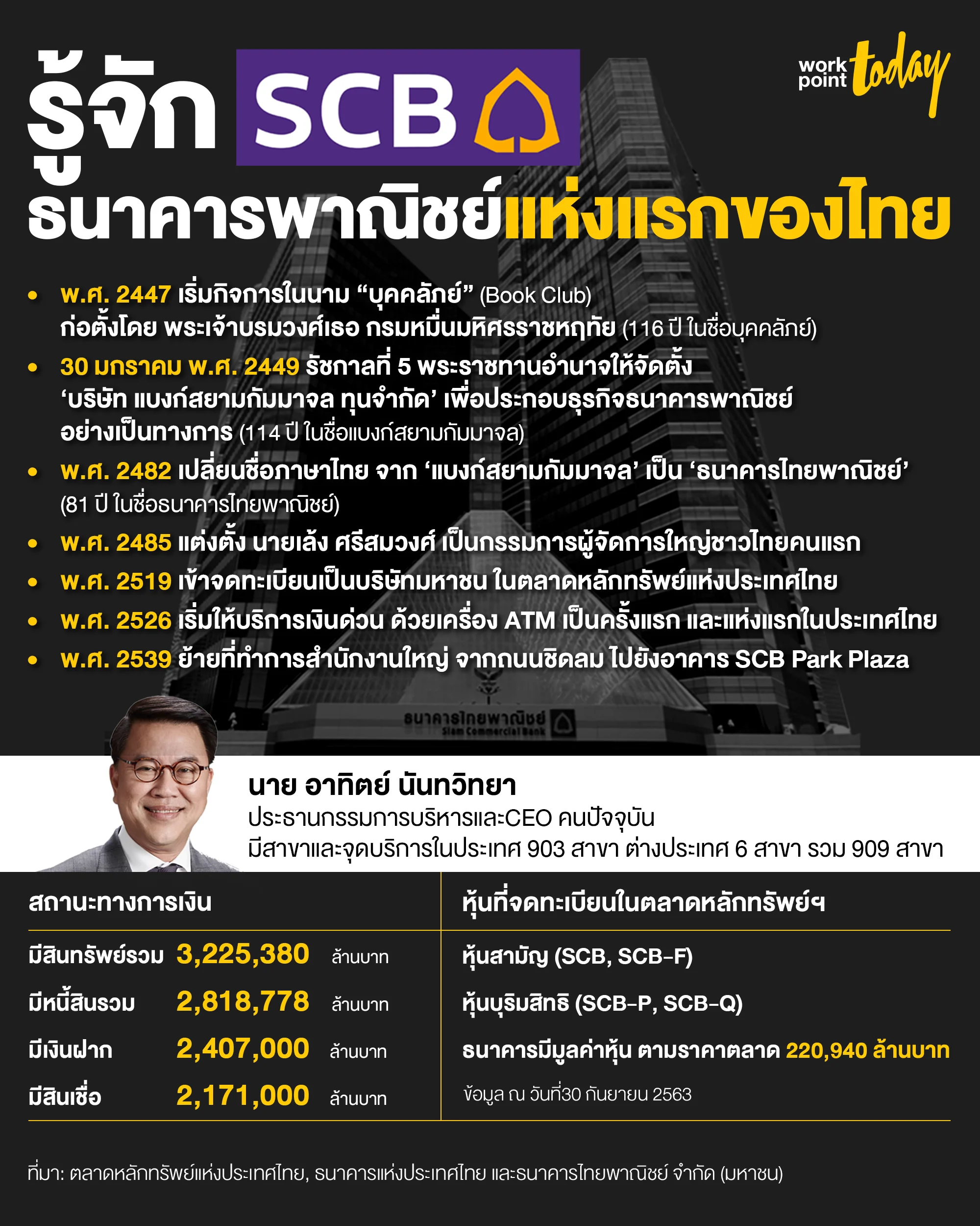 ธนาคารไทยพาณิชย์ จำกัด (มหาชน) (Siam Commercial Bank of Thailand) เป็นธนาคารพาณิชย์แห่งแรก ของไทยกิจการของธนาคารเริ่มต้นขึ้นในนาม ‘บุคคลัภย์’ (Book Club) ในวันที่ 4 ต.ค. พ.ศ. 2447 ก่อตั้งโดย พระเจ้าบรมวงศ์เธอ กรมหมื่นมหิศรราชหฤทัย เนื่องจากขณะนั้นทรงเชื่อว่า สยามประเทศมีความจำเป็น ต้องมีระบบการเงินธนาคาร เพื่อรองรับการเติบโตทางเศรษฐกิจการเงินของประเทศ หลังจากบุคคลัภย์ขยายตัวทางธุรกิจขึ้นเป็นลำดับ พระบาทสมเด็จพระจุลจอมเกล้าเจ้าอยู่หัว ทรงพระกรุณาโปรดเกล้าโปรดกระหม่อม พระราชทานอำนาจพิเศษ ให้จัดตั้ง ‘บริษัท แบงก์สยามกัมมาจล ทุนจำกัด’ เพื่อประกอบธุรกิจธนาคารพาณิชย์อย่างเป็นทางการ นับแต่วันที่ 30 ม.ค. พ.ศ. 2449 ประกอบธุรกิจธนาคารพาณิชย์อย่างเป็นทางการ เปิดทำการ ในที่ทำการเดิมของบุคคลัภย์ ตำบลบ้านหม้อ อำเภอพระนคร จังหวัดพระนคร