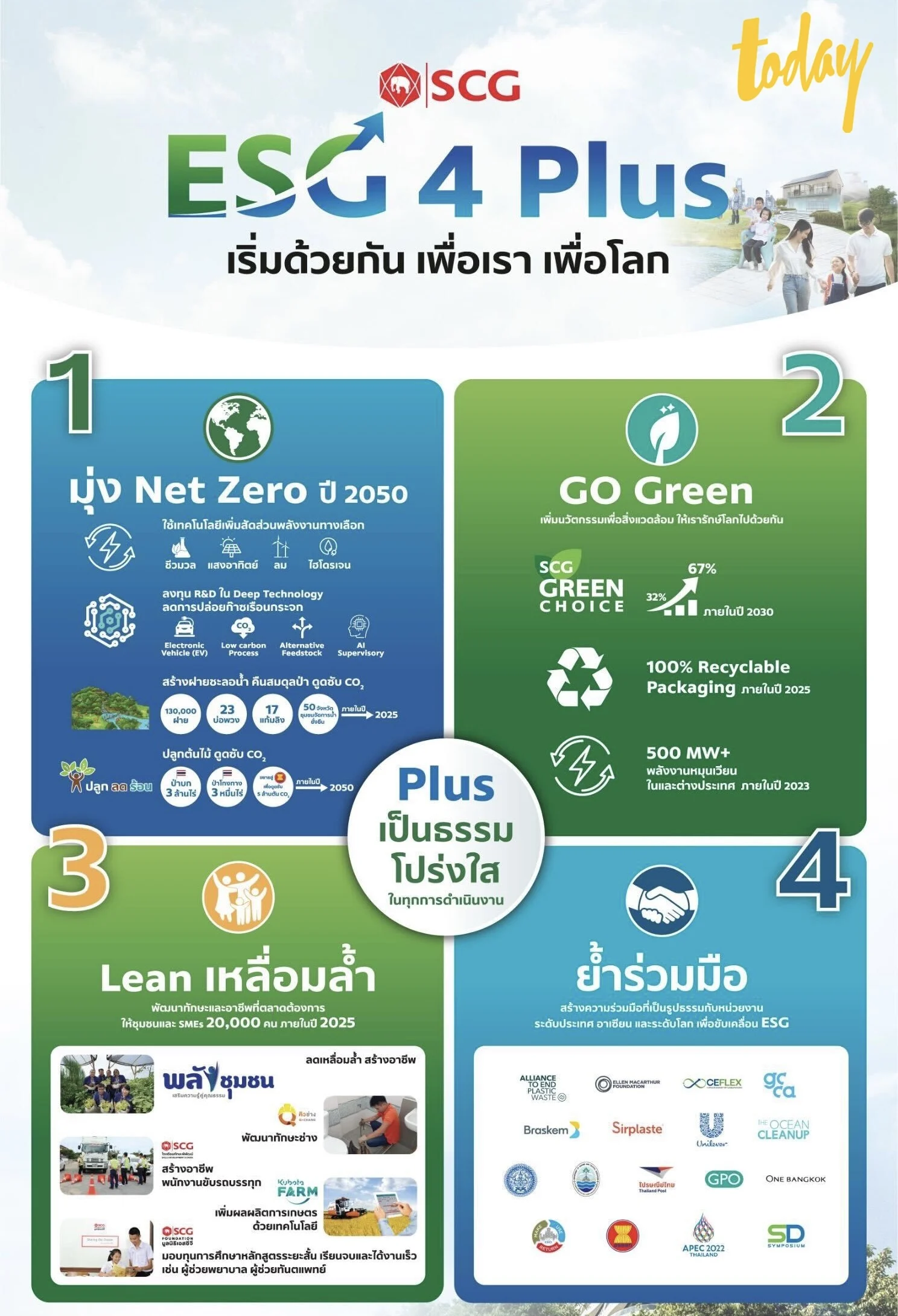 คุณรุ่งโรจน์ รังสิโยภาส กรรมการผู้จัดการใหญ่ เอสซีจี พร้อมคณะผู้บริหาร ร่วมประกาศเจตนารมณ์ว่า เอสซีจีและพนักงานทุกคนก็เป็นส่วนหนึ่งของโลกใบนี้ จึงอยากจะมีส่วนร่วมรับผิดชอบ และชวนทุกภาคส่วนมาช่วยกันแก้ปัญหาที่โลกกำลังเผชิญอยู่ ด้วย “ESG” (Environmental, Social, Governance) ซึ่งเป็นกรอบการพัฒนาอย่างยั่งยืนที่เป็นมาตรฐานการดำเนินธุรกิจระดับโลก สอดคล้องกับเป้าหมายการพัฒนาที่ยั่งยืน SDGs (Sustainable Development Goals) ของสหประชาชาติ และโมเดล BCG Economy (Bio-Circular-Green Economy) ของประเทศ โดยมี “ESG 4 Plus” คือ “มุ่ง Net Zero – Go Green – Lean เหลื่อมล้ำ – ย้ำร่วมมือ – Plus เป็นธรรม โปร่งใส” เป็นแนวทางสำคัญในการขับเคลื่อน