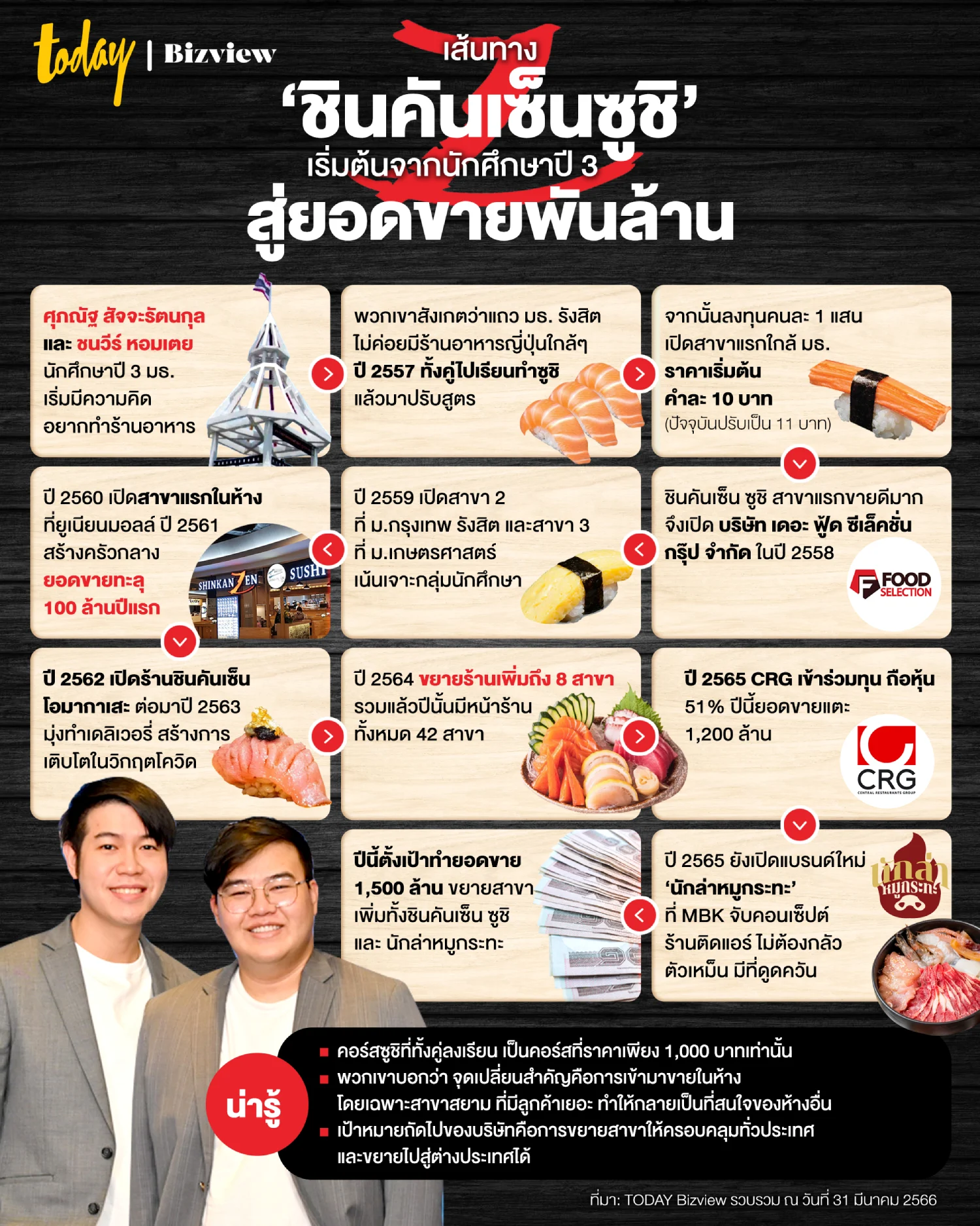 แต่ ‘ชินคันเซ็น ซูชิ’ ร้านซูชิราคาย่อมเยาที่ก่อตั้งเมื่อราว 9 ปีก่อนโดยนักศึกษาปี 3 สามารถสร้างการเติบโตจนทุกวันนี้ขยายหน้าร้านไปกว่า 44 สาขา ยอดขายทะลุพันล้าน ทั้งยังเปิดแบรนด์ใหม่อย่างนักล่าหมูกระทะขึ้นมาอีก