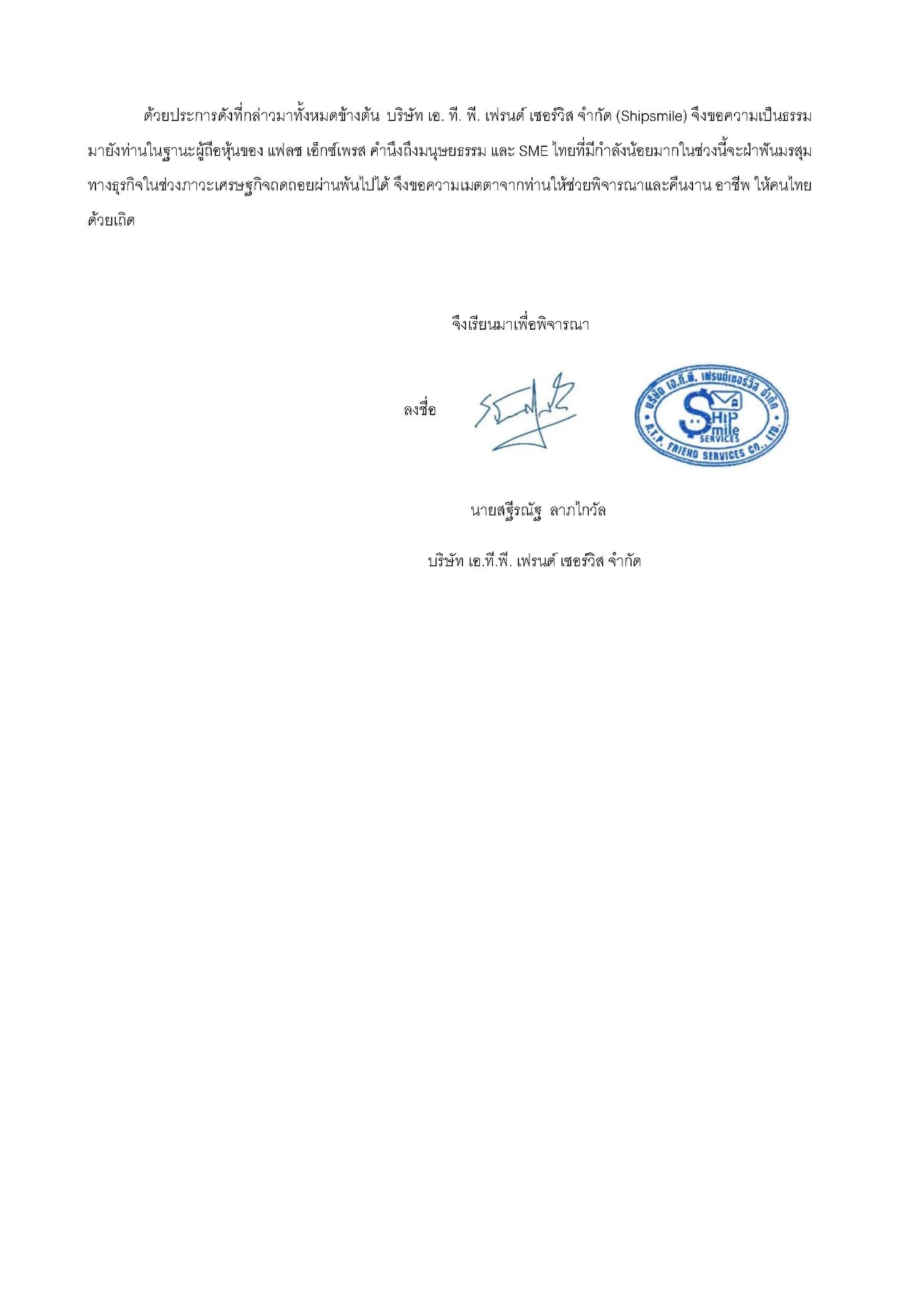 โดย ShipSmile ได้ระบุในตอนท้ายว่า “ด้วยประการดังที่กล่าวมาทั้งหมดข้างตัน บริษัท เอ. ที. พี. เฟรนด์ เซอร์วิส จำกัด (ShipSmile) จึงขอความเป็นธรรมมายังท่านในฐานะผู้ถือหุ้นของ แฟลช เอ็กซ์เพรส คำนึงถึงมนุษยธรรม และ SME ไทยที่มีกำลังน้อยมากในช่วงนี้จะฝ่าฟันมรสุมทางธุรกิจในช่วงภาวะเศรษฐกิจถดถอยผ่านพันไปได้ จึงขอความเมตตาจากท่านให้ช่วยพิจารณาและคืนงานอาชีพให้คนไทยด้วยเถิด”