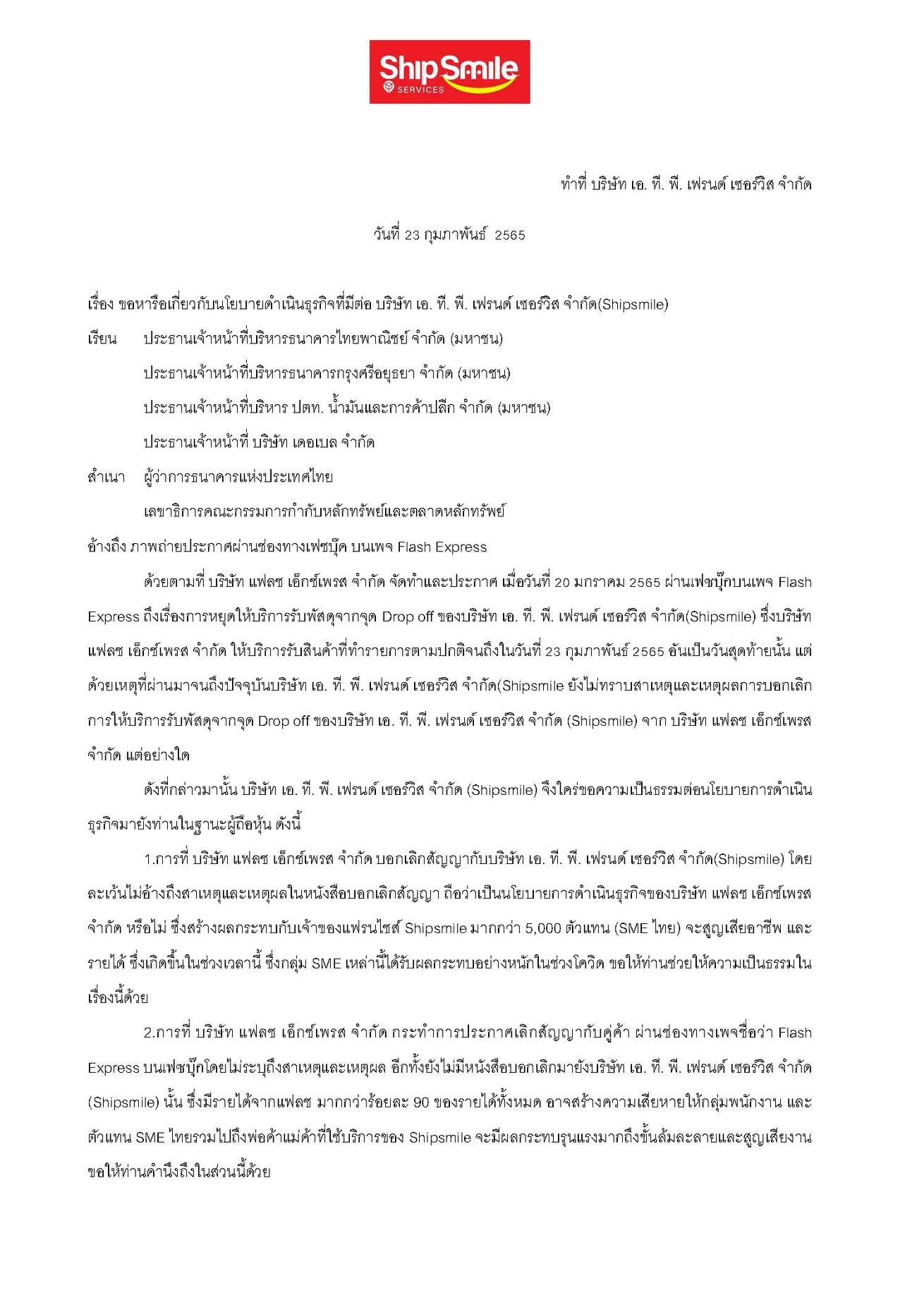 บริษัท เอ.ที.พี.เฟรนด์เซอร์วิส จำกัด หรือ ‘ShipSmile’ แฟรนไชส์ศูนย์รวมขนส่งที่ทำธุรกิจบริการจุดรับ-ส่งไปรษณีย์เอกชนทั่วประเทศ โพสต์จดหมายถึง ‘ผู้ถือหุ้น’ ของบริษัท แฟลช เอ็กซ์เพรส จำกัด (Flash Express)