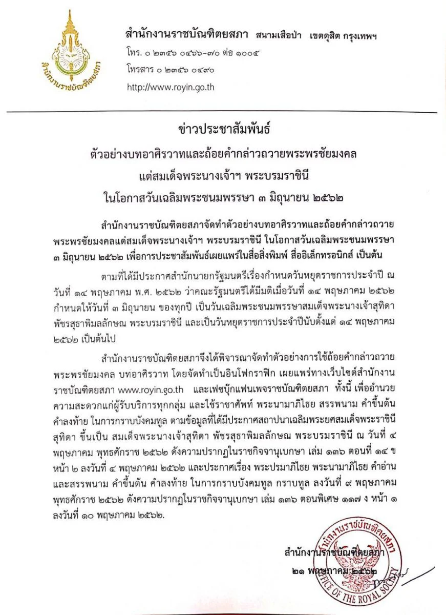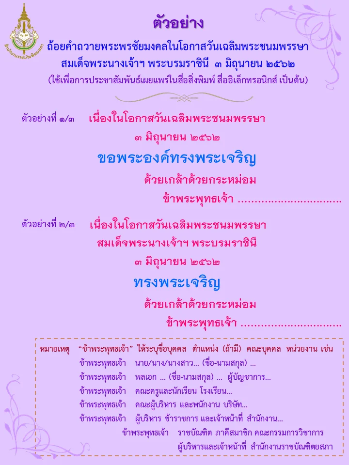 สํานักงานราชบัณฑิตยสภาจัดทําตัวอย่างบทอาศิรวาทและถ้อยคํากล่าวถวาย พระพรชัยมงคลแด่สมเด็จพระนางเจ้าฯ พระบรมราชินี ในโอกาสวันเฉลิมพระชนมพรรษา 3 มิถุนายน 2562