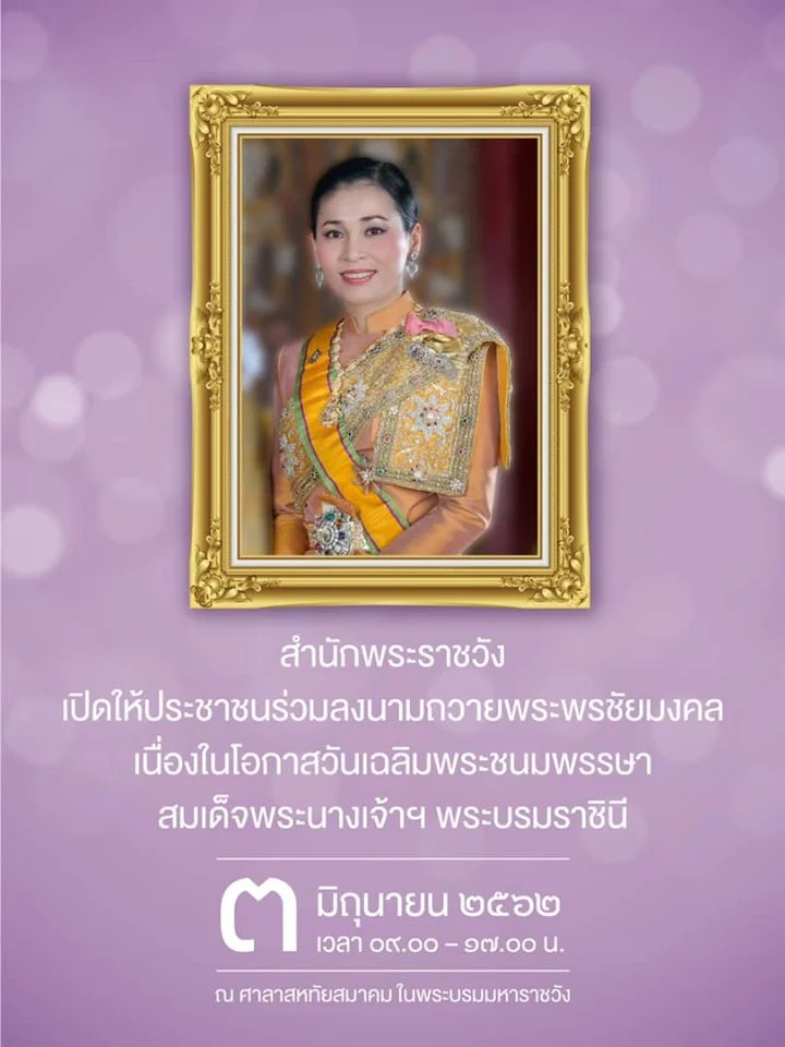 สำนักพระราชวัง เปิดให้ประชาชนร่วมลงนามถวายพระพรชัยมงคล เนื่องในโอกาสวันเฉลิมพระชนมพรรษา สมเด็จพระนางเจ้าสุทิดา พัชรสุธาพิมลลักษณ พระบรมราชินี ในวันจันทร์ที่ 3 มิถุนายน 2562 ตั้งแต่เวลา 09.00 – 17.00 น.
