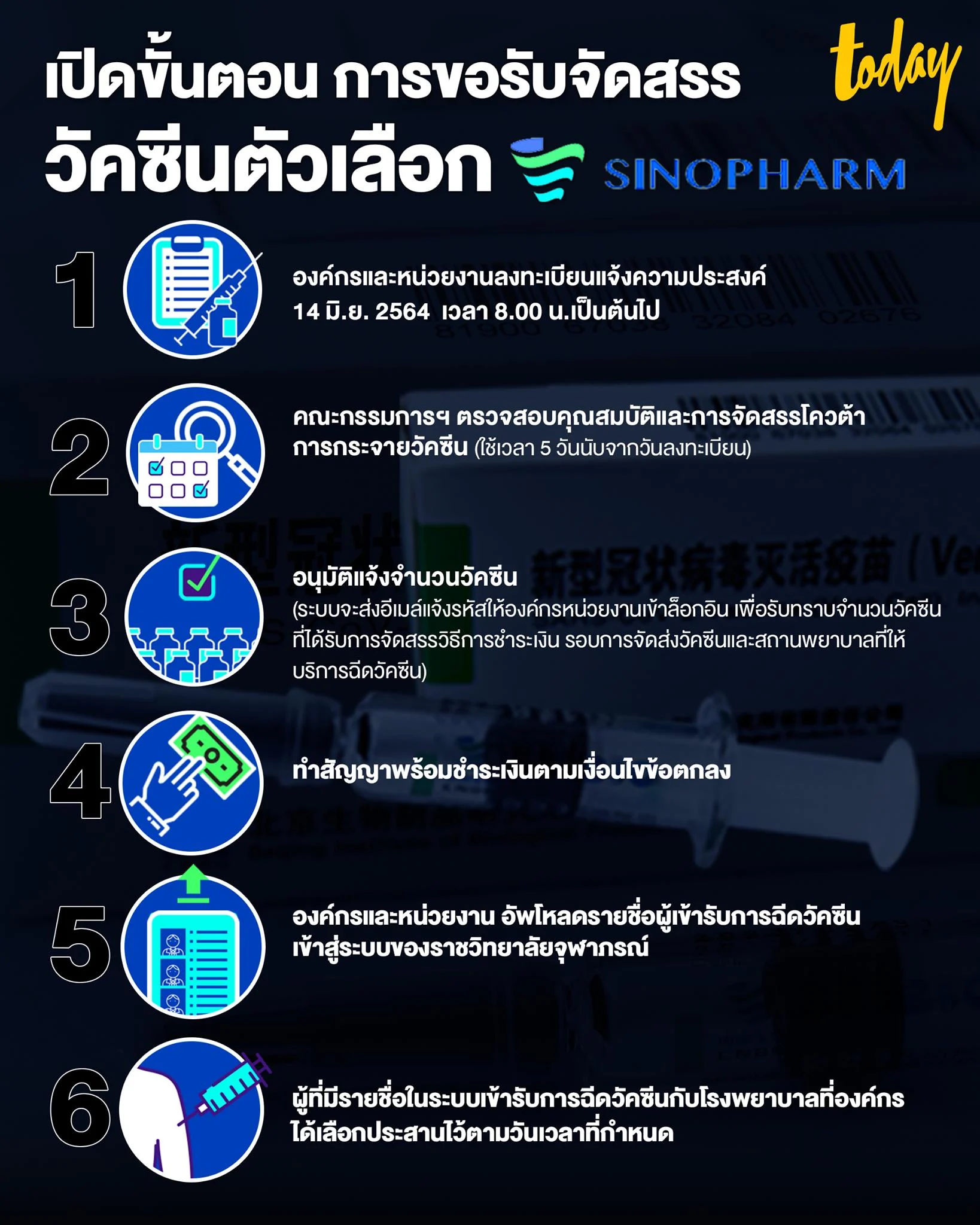 1 องค์กร/หน่วยงานลงทะเบียนแจ้งความประสงค์ ขอรับการจัดสรรวัคซีนโควิดตัวเลือกซิโนฟาร์ม ผ่านระบบออนไลน์ได้ที่ https://vaccine.cra.ac.th ตั้งแต่วันที่ 14 มิถุนายน 2564 เวลา 8.00 น. เป็นต้นไป