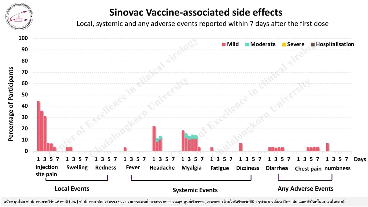 ในช่วงต้นการฉีดวัคซีนซึ่งส่วนใหญ่จะเป็นวัคซีนซิโนแวค (Sinovac) และในผู้สูงอายุจะใช้วัคซีนแอสตร้าเซนเนก้า (AstraZeneca) ปัญหาอาการข้างเคียงที่เกิดขึ้นจะไม่ค่อยพบมาก