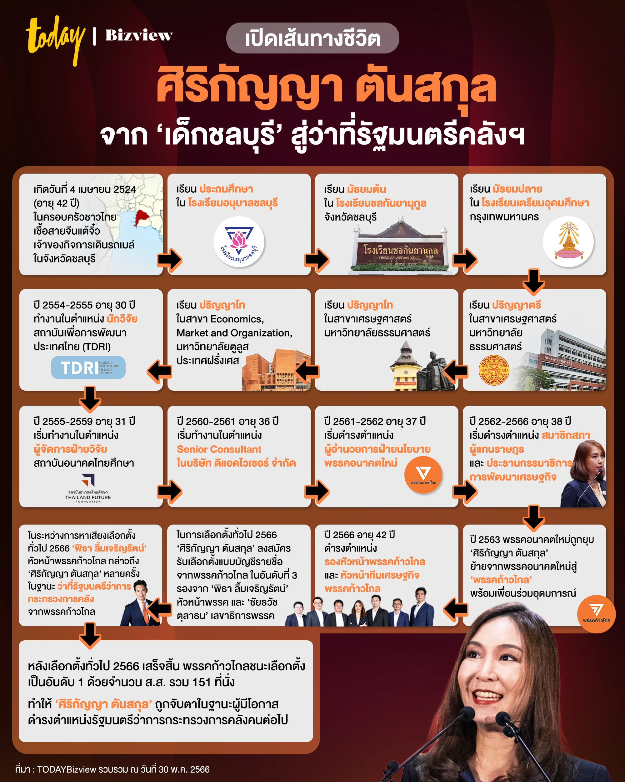 ใช้ชีวิตวัยเด็กในจังหวัดชลบุรี ก่อนจะเข้ามาเรียนหนังสือในกรุงเทพมหานคร และข้ามประเทศไปเรียนไกลถึงฝรั่งเศส กลับมาทำงานในประเทศไทยด้วยอาชีพ ‘นักวิจัย’ ศึกษาเกี่ยวกับเศรษฐกิจไทยและความเหลื่อมล้ำในสังคมไทย และเริ่มต้นงานทางการเมืองใน ‘พรรคอนาคตใหม่’ ก่อนถูกยุบพรรคและขยับมาสู่ ‘พรรคก้าวไกล’ ที่ลงเลือกตั้งและชนะเป็นอันดับ 1 ในการเลือกตั้งรอบนี้ ทำให้ ‘ศิริกัญญา ตันสกุล’ กลายเป็น ‘ตัวเต็งรัฐมนตรีคลัง’
