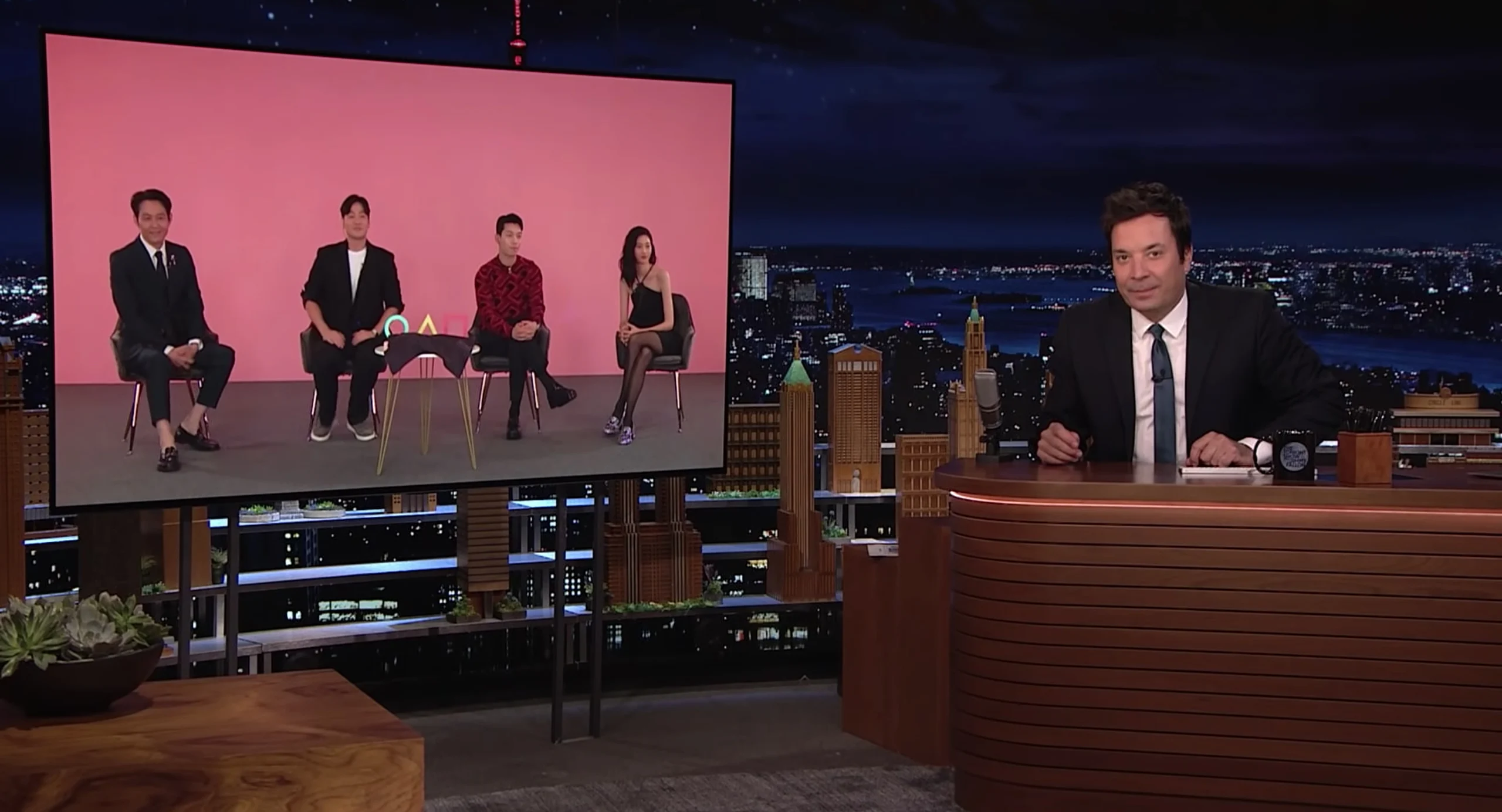ล่าสุด 7 ต.ค. 2564 ที่ผ่านมา อีจองแจ, พัคแฮซู, วีฮาจุน และ จองโฮยอน 4 นักแสดงนำจากซีรีส์ Squid Game ได้สร้างเซอร์ไพรส์ให้กับแฟนๆ กับการปรากฏตัวในรายการทอล์กโชว์ชื่อดังของอเมริกา ‘The Tonight Show Starring Jimmy Fallon’ เพื่อร่วมพูดคุยกับพิธีกร Jimmy Fallon ถึงเบื้องหลังการถ่ายทำเเละการแสดงของพวกเข้าทั้ง 4 คน พร้อมเล่นเกมส์เด็กเล่น ที่สร้างเรียกเสียงหัวเราะเเละรอยยิ้มในสตูดิโอ