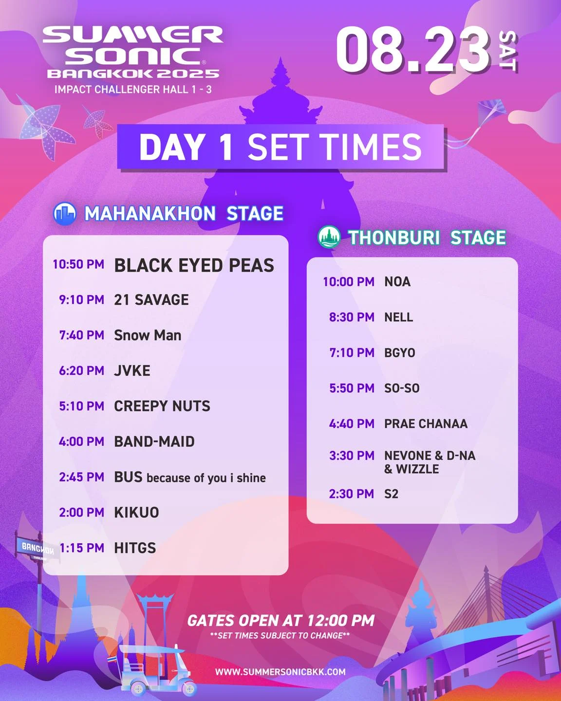 SUMMER SONIC BANGKOK 2025 ปีนี้ จัดเต็ม 2 เวทีหลัก 2 วันสุดมันส์ เต็มอิ่มศิลปินแน่นเวที ที่ยิ่งใหญ่กว่าเดิม โดยเวที Mahanakhon สายพลัง สายเอเนอจี้ห้ามพลาด! เตรียมกระโดดให้สุดเสียงกับศิลปินตัวพ่อ ตัวแม่จากทั้งฝั่งตะวันตกและเอเชีย ที่จะมาสะกดเวทีแบบ non-stop! นำทีมโดย BLACK EYED PEAS, ALICIA KEYS, CAMILA CABELLO, 21 SAVAGE, Snow Man, CHANYEOL, JVKE, BABYMETAL, CREEPY NUTS, THE ROSE, BAND-MAID, BE:FIRST, KIKUO, KickFlip, HITGS, JEFF SATUR, BUS และลำไย ไหทองคำ