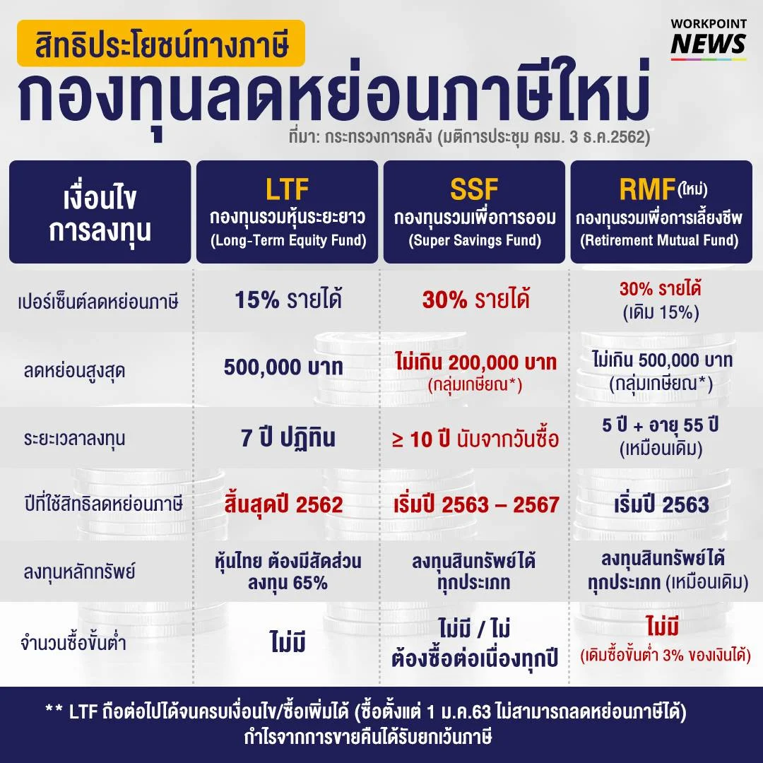 ครม.เห็นชอบกองทุนเพื่อการออมระยะยาวรูปแบบใหม่ (SSF) แทน LTF ที่จะสามารถลดหย่อนภาษีได้ปีนี้เป็นปีสุดท้าย โดยกำหนดให้ลงทุน 10 ปี ลดหย่อนภาษีไม่เกิน 2 แสนบาท สามารถนำมาหักลดหย่อนภาษีเงินได้บุคคลธรรมดาได้เพิ่มขึ้นเป็น 30% (จากเดิม 15%) ลงทุนหลักทรัพย์ทุกประเภท ไม่มีขั้นต่ำ ไม่ต้องซื้อต่อเนื่อง รองรับการออมคนรุ่นใหม่ เตรียมเปิดจำหน่าย ก.พ. 63