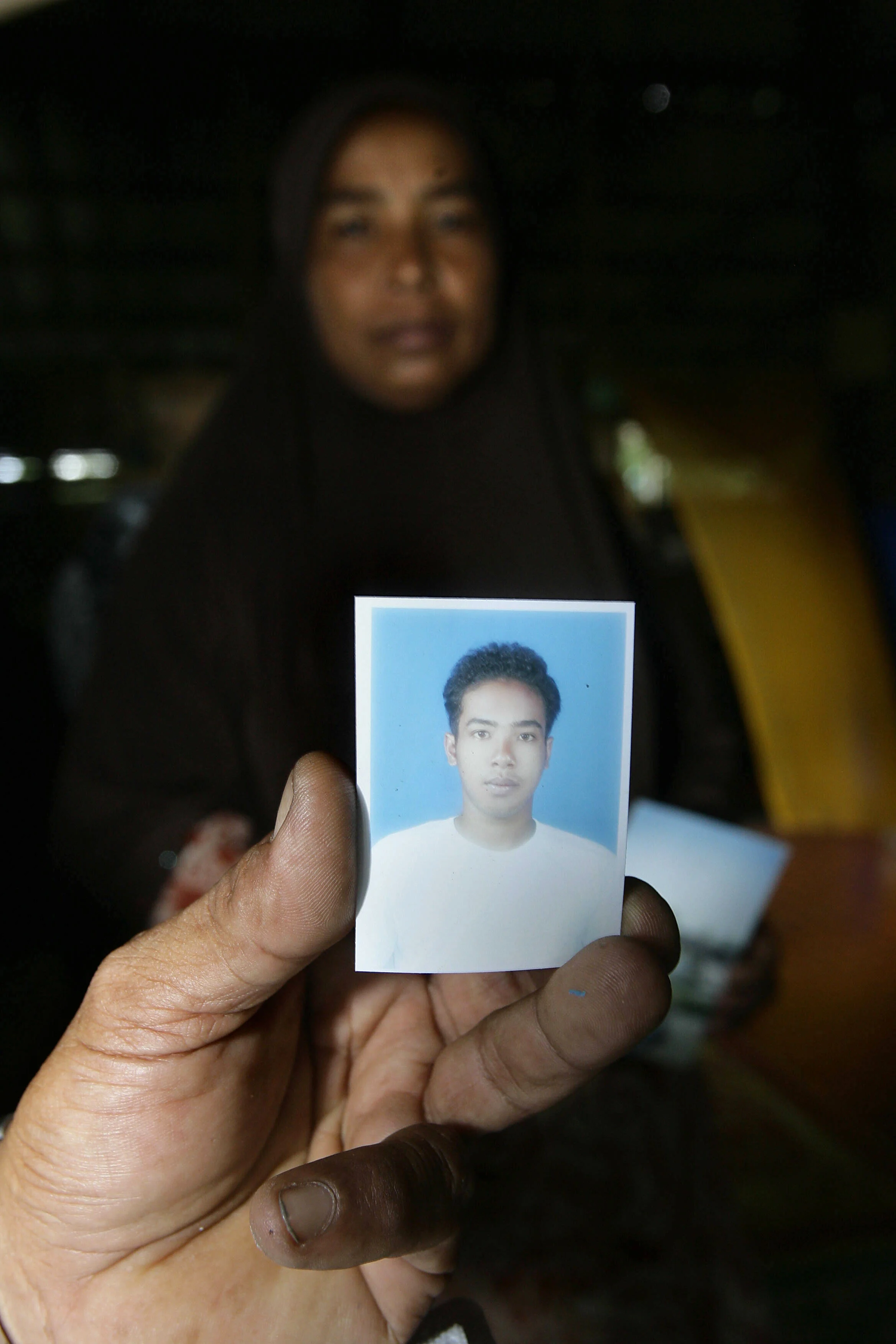 AFP บรรยายภาพนี้ว่าเป็นภาพของมารดาของสุไลมาน แนซา อาชีพเกษตรกรและคนงานก่อสร้าง นั่งอยู่เบื้องหน้าภรรยาของเขาในบ้านที่จังหวัดปาตานี โชว์ภาพลูกชายที่เสียชีวิตในวัย 25 ปี ระหว่างการจับคุมในค่ายทหาร ครั้งสุดท้ายที่ครอบครัวเจอสุไลมานคือตอนที่ทหารจับตัวไปสอบถามเนื่องจากสงสัยว่าเกี่ยวข้องกับเหตุการณ์ความรุนแรงหรือไม่ ทหารบอกครอบครัวในภายหลังว่าเขาเสียชีวิตด้วยการผูกคอตาย แต่ญาติเชื่อว่าเขาถูกทรมาณจนเสียชีวิต (Photo by MADAREE TOHLALA / AFP)