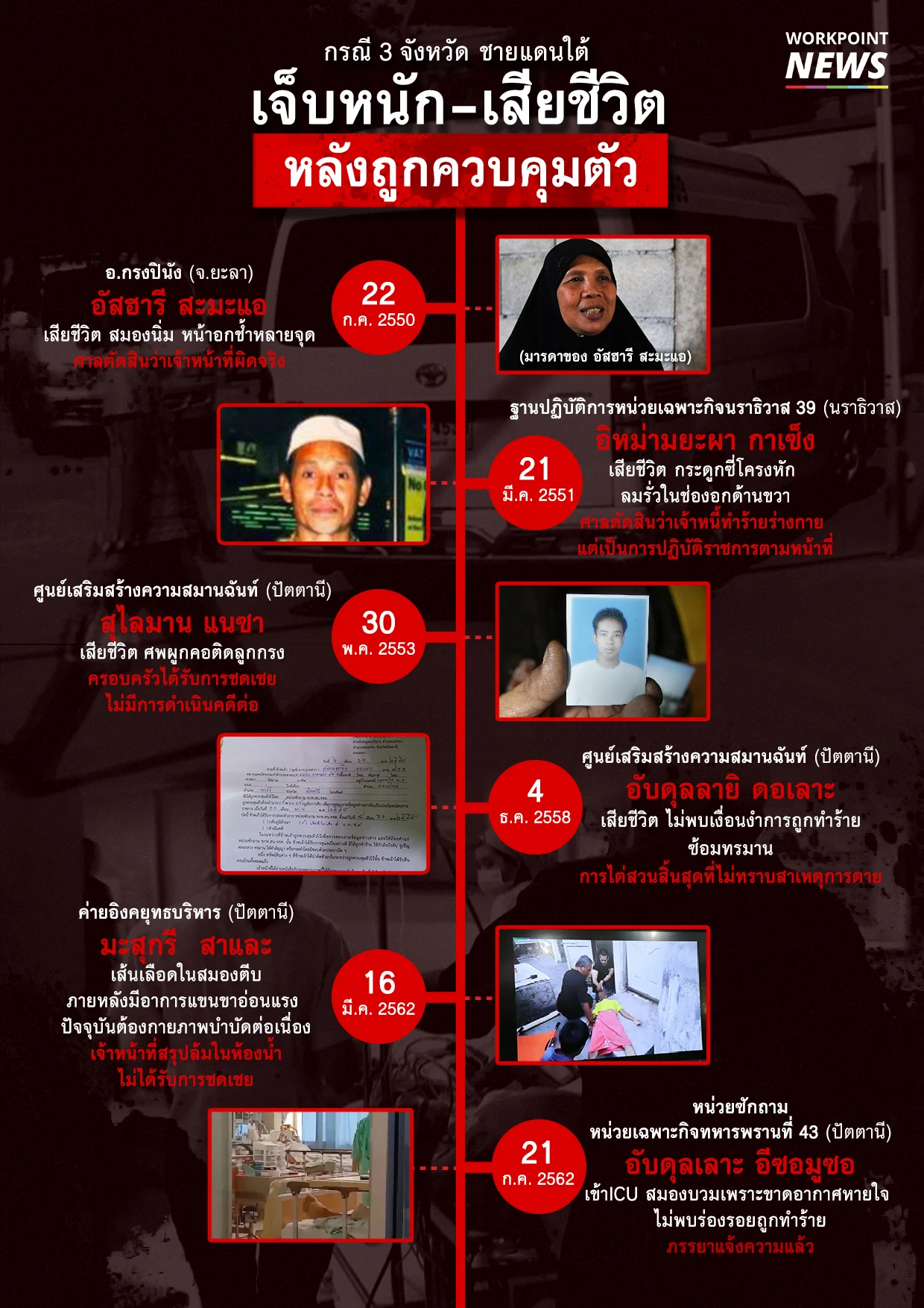 จากกรณีอับดุลเลาะ อีซอมูซอ ผู้ต้องสงสัยคดีความมั่นคงหมดสติเข้ารักษาตัวห้องไอซียู รพ.ปัตตานี หลังถูกคุมตัวเข้าค่ายทหาร ทีมข่าวเวิร์คพอยท์ย้อนดูกรณี “ผู้ต้องสงสัย” บาดเจ็บสาหัส-เสียชีวิตระหว่างการถูกควบคุมตัวโดยเจ้าหน้าที่รัฐ ในบริเวณ 3 จังหวัดชายแดนภาคใต้ ทั้งที่ยังไม่มีการตั้งข้อหาและไม่ได้ผ่านกระบวนการยุติธรรม