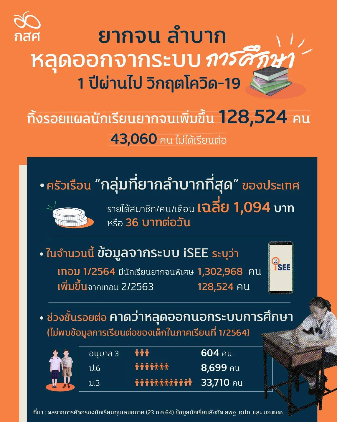 “ผลกระทบจากการแพร่ระบาดของโควิด-19 ที่ผ่านมา ทำให้รายได้ของครอบครัวเด็กและเยาวชนกลุ่มนี้ลดลงเหลือเฉลี่ยเดือนละ 1,094 บาท อีกทั้งในรายละเอียดพบว่า รายได้จากการเกษตรหรือด้านอื่น ๆ ส่วนใหญ่ลดลง แต่รายได้ที่เพิ่มมาจากสวัสดิการรัฐ เงินช่วยเหลือเยียวยา และผลกระทบที่เกิดขึ้นทำให้จำนวนเด็กยากจนพิเศษที่คัดกรองรอบใหม่ภาคเรียนที่ 1/2564 เพิ่มมากขึั้นเป็นนิวไฮ คือ 1,302,968 คน หรือเพิ่มขึ้น 128,524 คน จากภาคเรียนที่ 2/2563 โดยคาดหวังว่าจำนวนเด็กที่ยากจนฉับพลันหลังสถานการณ์โควิด-19 จะเป็นแค่เพียงสถานการณ์ชั่วคราวที่จะคลี่คลายและกลับไปสู่สภาวะปกติได้ในอีกในระยะเวลาไม่นาน