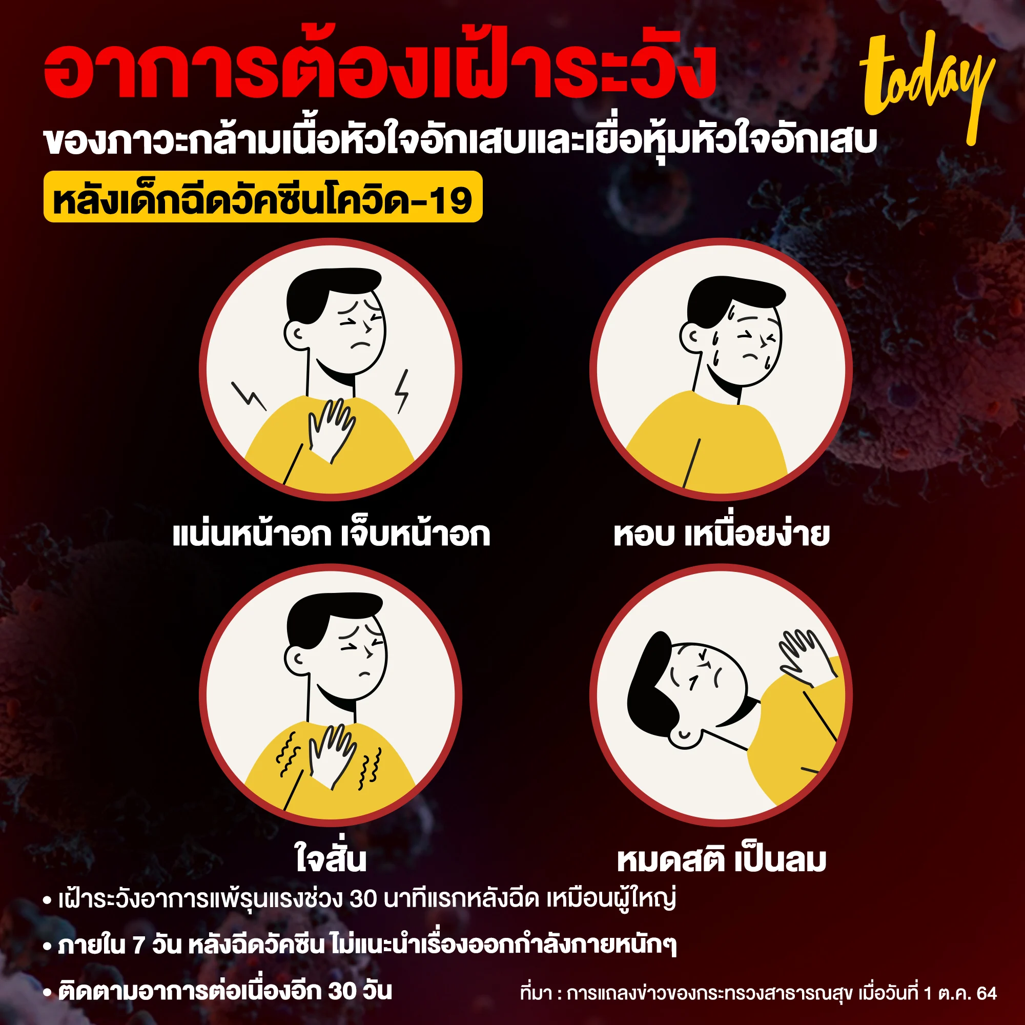 นพ.เกียรติภูมิ วงศ์รจิต ปลัดกระทรวงสาธารณสุข กล่าวว่า จากข้อมูลผลงานวิจัยในต่างประเทศ ในกลุ่มคนที่ได้รับวัคซีนชนิด mRNA ได้แก่ ไฟเซอร์และโมเดอร์นา พบว่ามีความเสี่ยงเล็กน้อยที่จะมีอาการกล้ามเนื้อหัวใจอักเสบ (myocarditis) ซึ่งพบบ่อยกว่าในเด็ก โดยเฉพาะอย่างยิ่งในเด็กผู้ชายหลังรับวัคซีนโดสที่ 2 อาจทำให้เจ็บหน้าอกหัวใจเต้นแรง แต่อาการจะหายไปเองใน 1 สัปดาห์ สำหรับประเทศไทยพบอาการกล้ามเนื้อหัวใจอักเสบที่คณะผู้เชี่ยวชาญวินิจฉัยแล้วว่ามีความเกี่ยวข้องกับวัคซีนเพียง 1 ราย เป็นเด็กชายอายุ 13 ปี มีภาวะโรคอ้วน แต่สามารถรักษาหายเป็นปกติแล้ว ส่วนกรณีที่ผู้ปกครองมีความกังวลและประสงค์ให้บุตรหลานฉีดวัคซีนชนิดเชื้อตายนั้น หากบริษัทผู้ผลิตยื่นเอกสารขึ้นทะเบียนปรับการใช้ในเด็กกับสำนักงานคณะกรรมการอาหารและยาเรียบร้อยแล้ว กระทรวงสาธารณสุขจะจัดบริการเพิ่มเติมให้ต่อไป