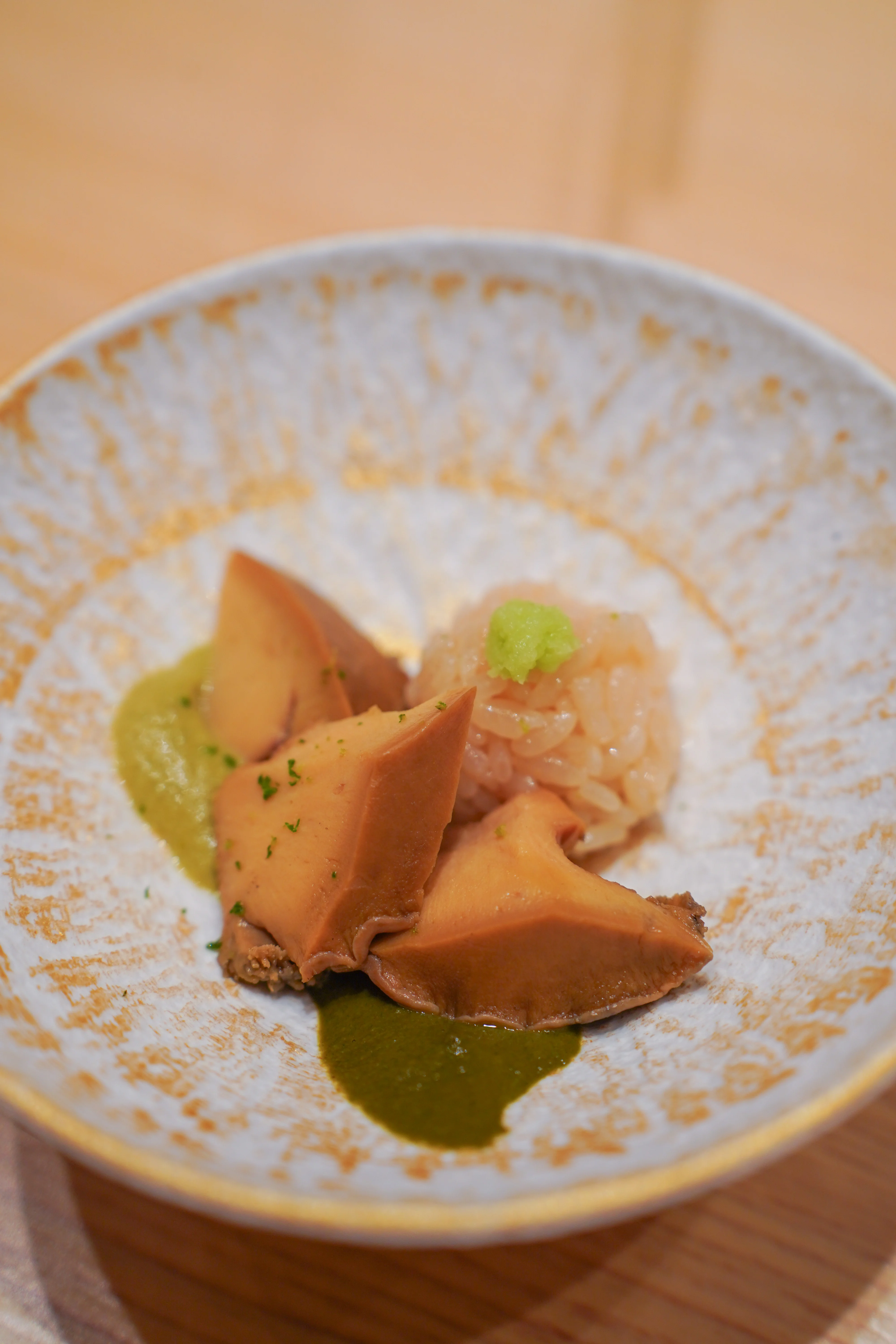 ต่อกันที่ Awabi หรือ เป๋าฮื้อญี่ปุ่นเสิร์ฟพร้อมข้าวและซอส 2 แบบ สูตรของเชฟยามะคาว่า มีทั้งแบบครีมมี่และแบบเข้มข้น โดยเริ่มรับประทานกับซอสครีมมี่ และ ตามด้วยเข้มข้น และผสมสองซอสเข้าด้วยกัน ซึ่งทำให้มีรสชาติหลากหลาย ต่างกันไปในแต่ละคำ