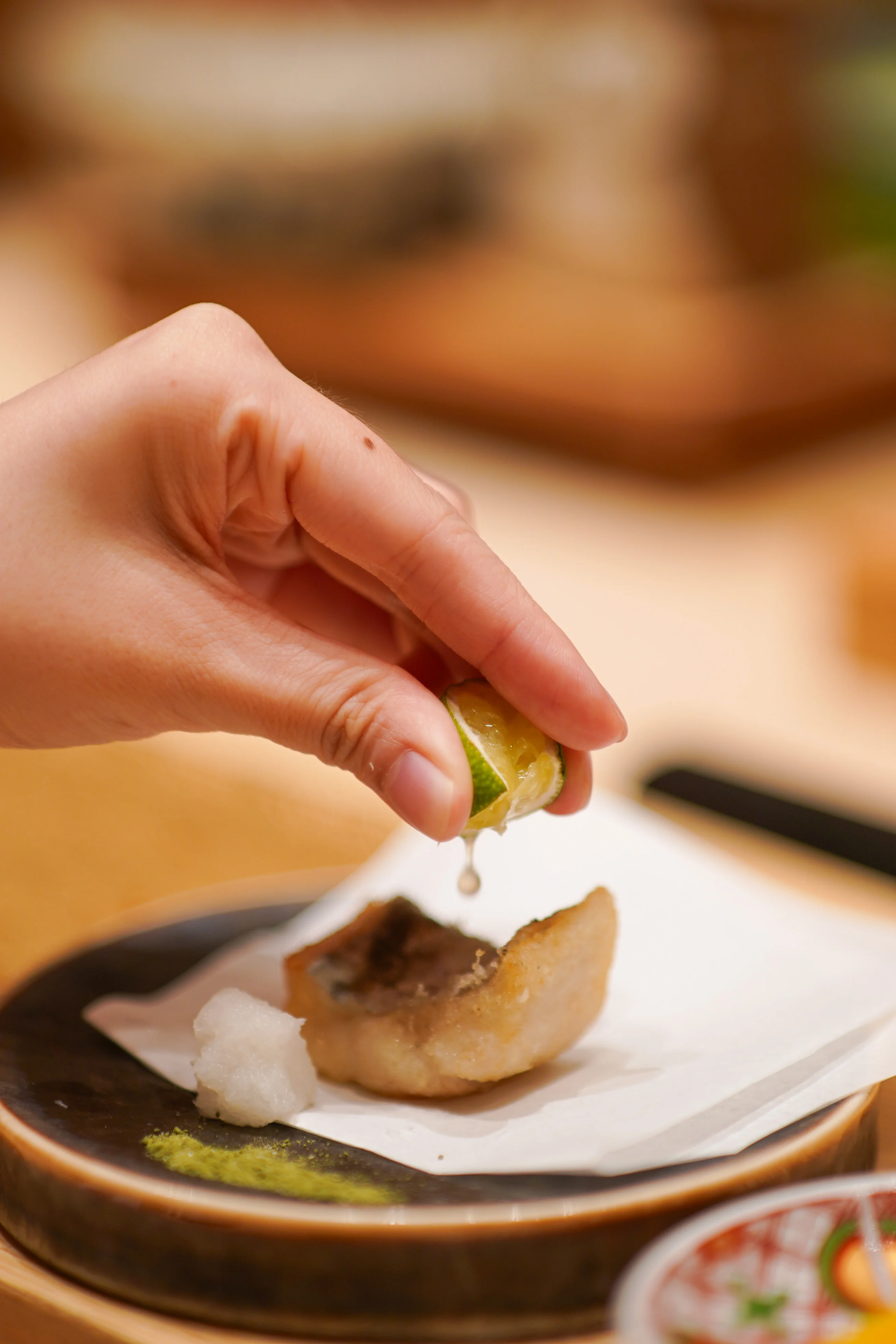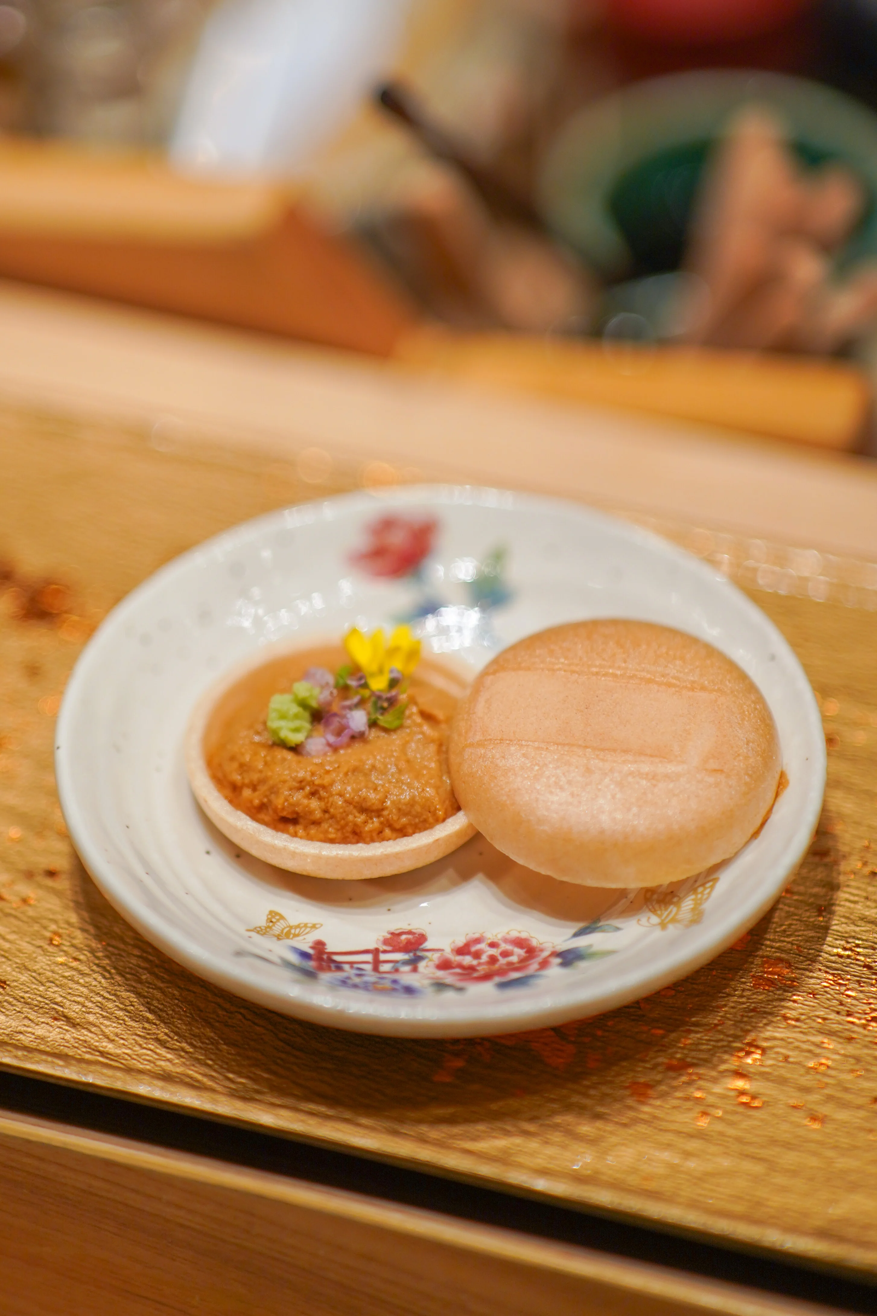 ตามมาด้วยตับปลา หรือ Ankimo ฟัวกราส์แห่งท้องทะเลที่เสิร์ฟมาในเวเฟอร์ คั่นด้วยมะเขือเทศ Jyunsai หวานเปรี้ยวล้างปาก ก่อนจะตามด้วยปลา Ayu ย่างเกลือและปูตัวจิ๋ว