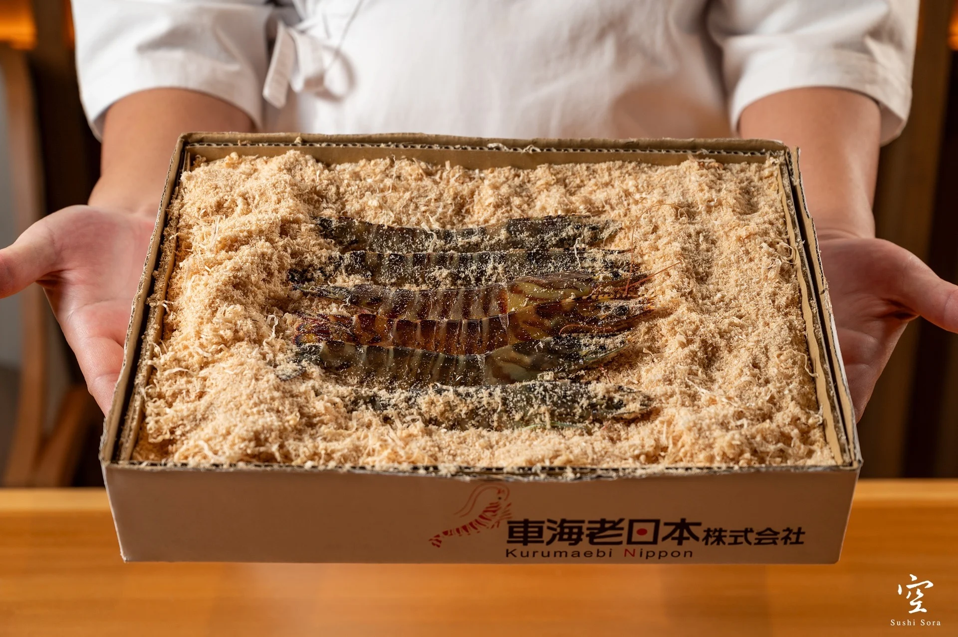 กุ้ง Kuruma Ebi หรือกุ้งลายเสือญี่ปุ่น มีรสชาติหวานและสดใหม่ เพราะทางร้านนำเข้ามาแบบเป็น ๆ โดยกุ้งจะถูกเก็บอยู่ในขี้เลื่อยในกล่องไม้จนถึงครัว