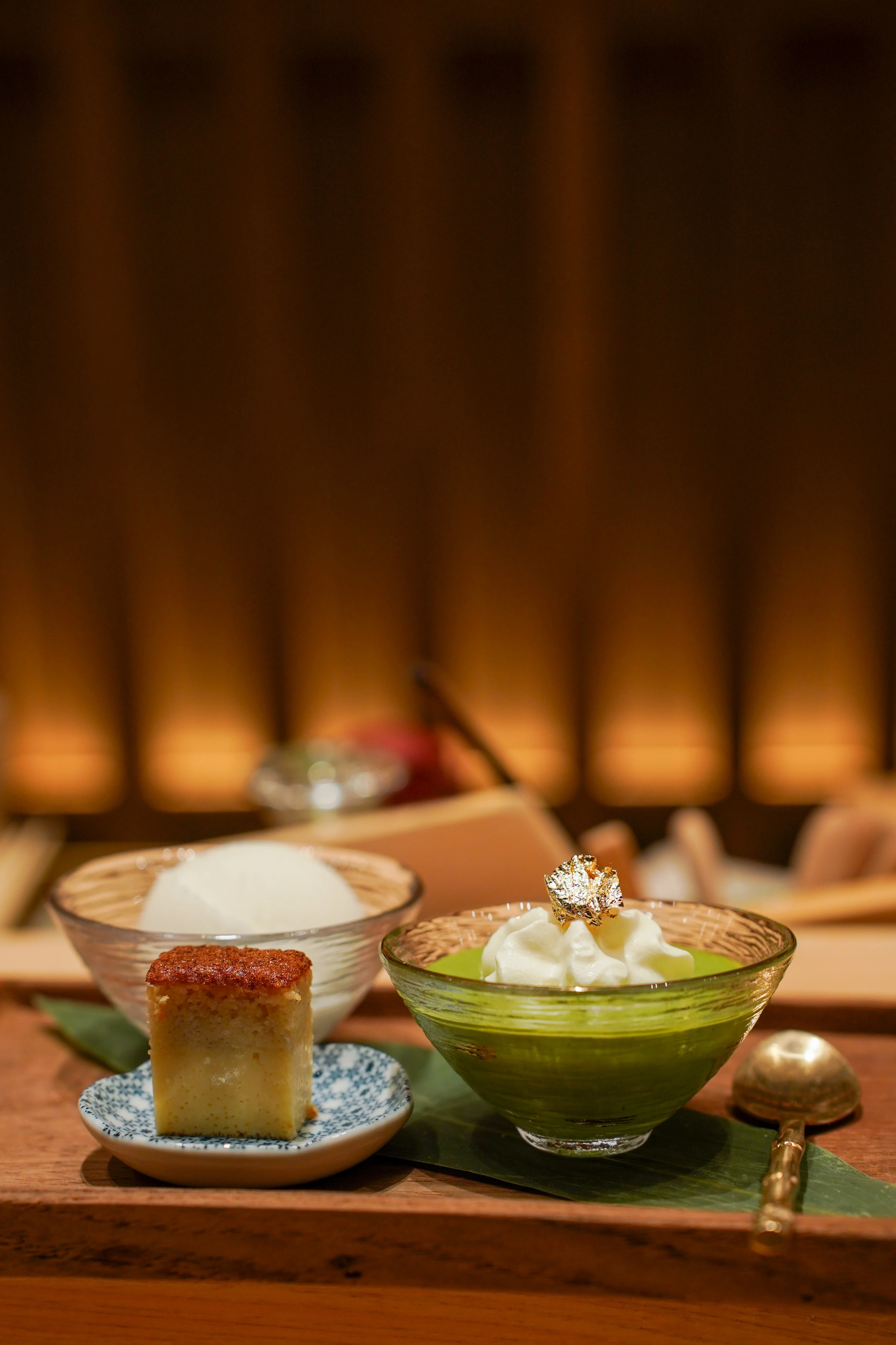 คำที่ใหญ่ที่สุดในคอร์สนี้คือ Sora roll ซิกเนเจอร์ของเชฟมีส่วนผสมของโอโทโร่ ชูโทโร่ ทาคุเอน ชูรสชาติด้วยสาหร่ายย่าง จากนั้นเราก็ล้างปากด้วยไข่หวานนุ่ม ๆ กำลังดี และตบท้ายด้วยขนมหวาน 2 อย่างเป็น Green Tea Pudding & Ice-cream