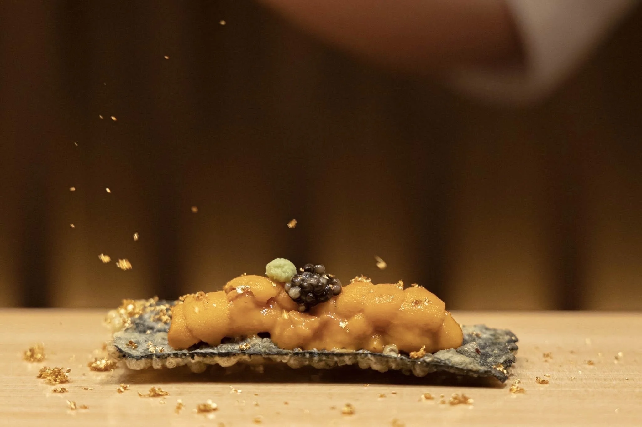 หอยเม่น Uni พันธุ์บาฟุนจากฮอกไกโด ที่เด่นเรื่องความอูมามิ รสชาติหวานและครีมมี่ไม่มีกลิ่นคาว เนื้อเนียนแน่นแต่ละลายในปาก เข้ากับสาหร่ายเทมปุระกรอบ ๆ ได้อย่างลงตัว