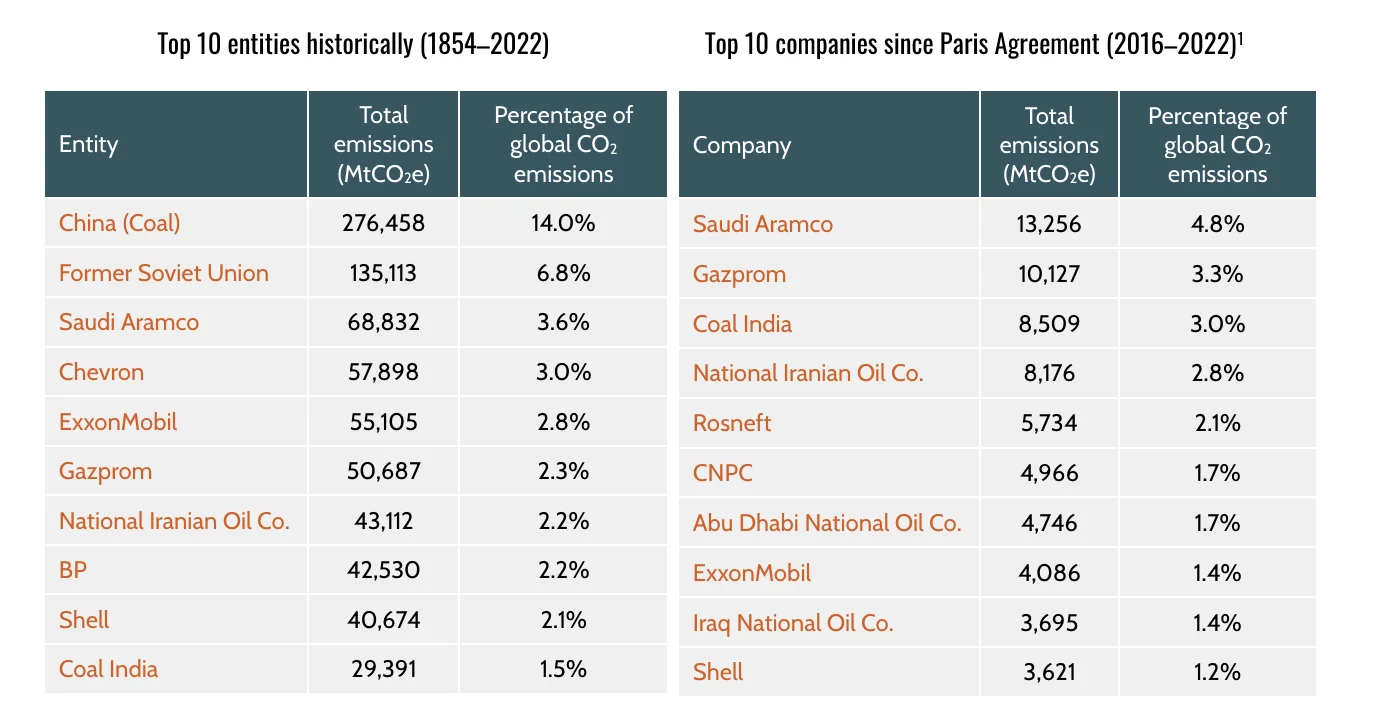 ตามรายงานของ Carbon Majors โดย InfluenceMap ซึ่งเป็นองค์กรไม่แสวงผลกำไร ระบุว่าบริษัทเหล่านี้ทั้งของรัฐ และเอกชน เกี่ยวข้องกับการปล่อยก๊าซคาร์บอนฯในโลกถึง 80%