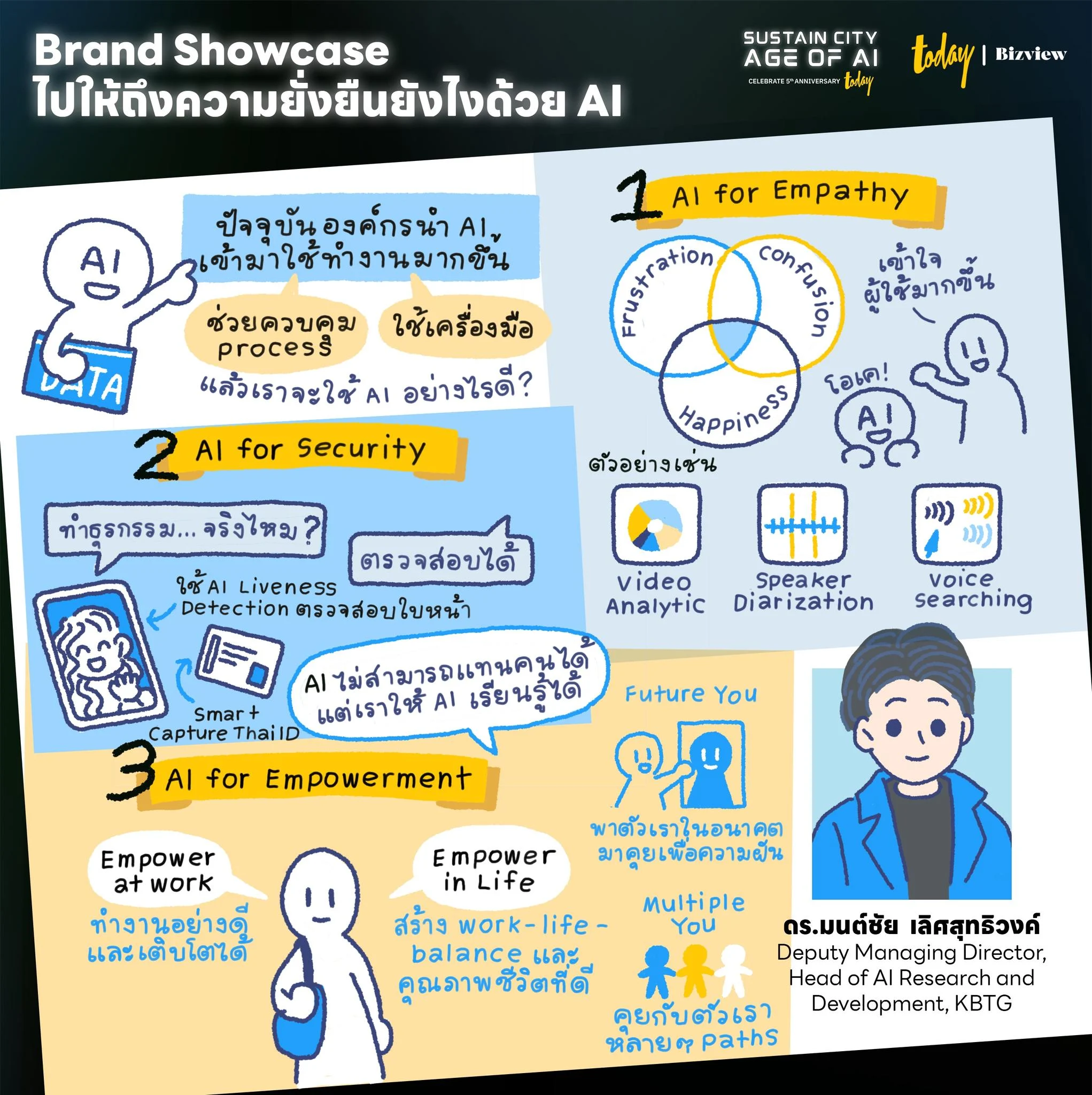 ในช่วง “Brand Showcase : ไปให้ถึงความยั่งยืนยังไงด้วย AI” มีผู้นำเสนอแนวคิด ได้แก่ ดร.มนต์ชัย เลิศสุทธิวงค์ Deputy Managing Director, Head of AI Research and Development, KBTG และคุณนิรมล ดิเรกมหามงคล กรรมการผู้จัดการ บริษัท ลิฟ-24 จำกัด (LIV-24)
