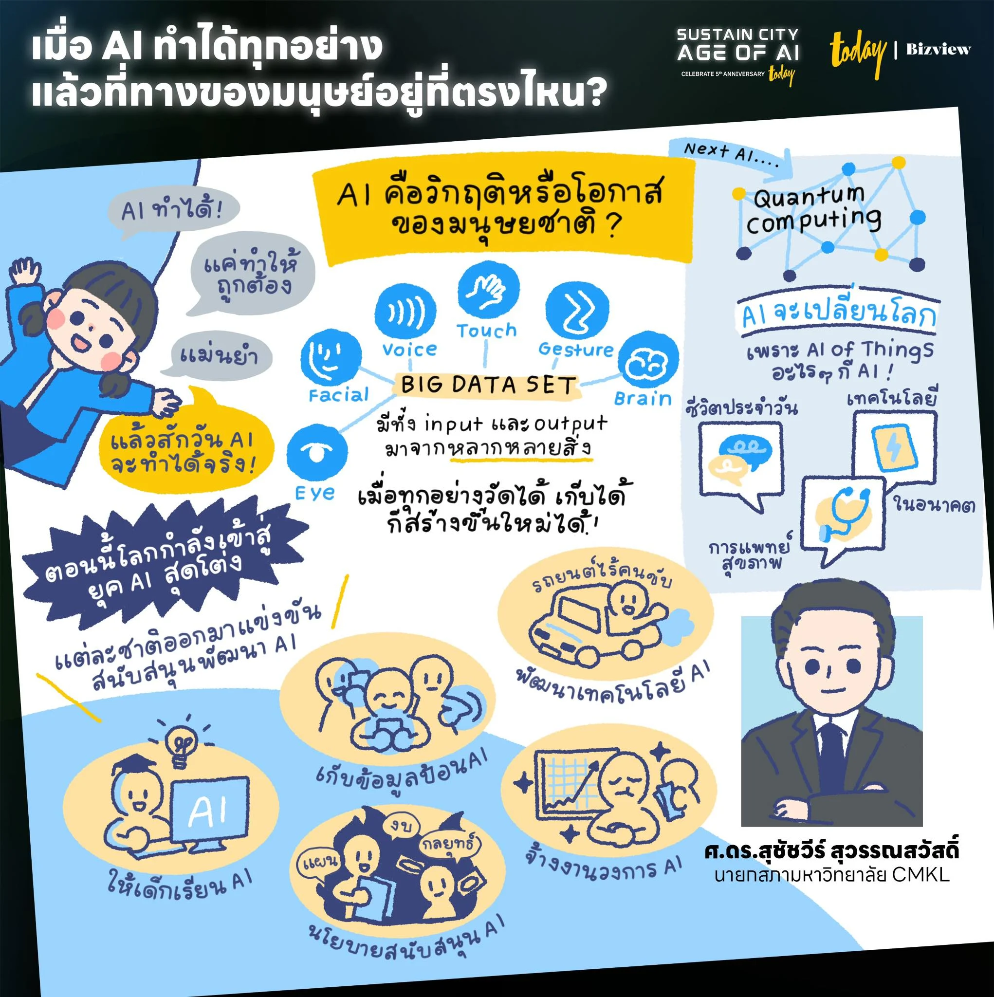 ‘ศ.ดร.สุชัชวีร์ สุวรรณสวัสดิ์’ นายกสภามหาวิทยาลัย CMKL ได้หยิบเรื่องน่าคิดมาแชร์บนเวทีว่า หลายคนกลัวว่า AI จะมาแทนที่ ซึ่งสิ่งที่ AI ทำได้มีหลายอย่างเกินจริง ขณะที่มนุษย์มีเซลล์สมองมากถึง 86,000 ล้านเซลล์ ดังนั้น ไม่มีทางที่ AI จะฉลาดเกินกว่ามนุษย์ แต่ AI จะสำคัญขึ้น มีบทบาทมากขึ้น และมีความสุดโต่งขึ้น