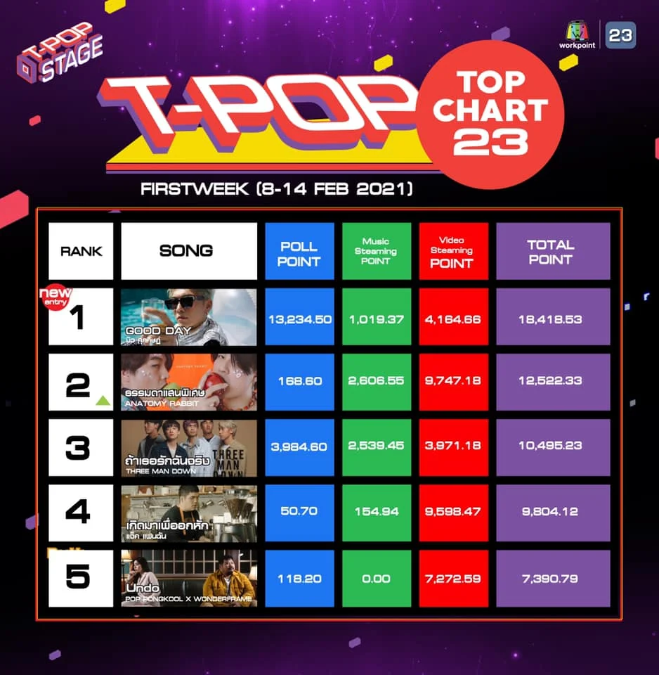 ขณะที่รางวัล T-POP Top Chart ในสัปดาห์นี้ รางวัลแรก MUSIC OF THE WEEK ตกเป็นของ มิว ศุภศิษฏ์ ในเพลง Good Day อันดับสองคือ ธรรมดาแสนพิเศษ จากวง Anatomy Rabbit เเละอันดับที่ 3 ถ้าเธอรักฉันจริง จากวง Three Man Down ขณะที่รางวัล ROOKIE OF THE WEEK ตกเป็นของ Oohlala! จากวง 4EVE