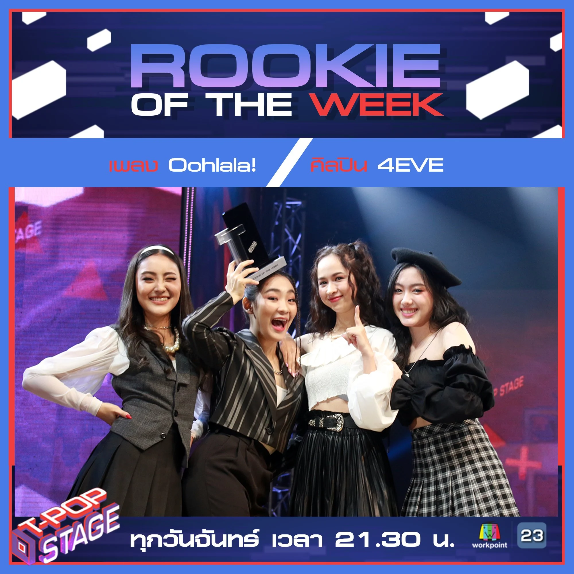 4EVE เผยว่า จริงๆ เเล้วพวกเรามีความฝันว่าอยากได้รางวัลรุกกี้ แบบนี้เลยค่ะ ต้องขอขอบคุณพี่ๆ เบื้องหลังที่สร้าง 4EVE ขอบคุณเมมเบอร์ทุกๆ คน วันนี้เรามากันเเค่ 4 คน เนื่องจากพี่ๆ บางคนติดภารกิจ เเล้วก็ขอบคุณแฟนคลับทุกๆ คน ที่โหวตให้พวกเรา ให้เราได้รับรางวัลนี้ก็ถือเป็นรางวัลเเรกของพวกเรา เเล้วก็ในอนาคตเราก็จะสร้างผลงานมาเรื่อยๆ ขอบคุณทาง T-POP Stage ที่สร้างเวทีนี้เพื่อให้วงการ T-POP ไทยได้มาโชว์ฝีมือ เเละก็มีพื้นที่ในการโปรโมตสื่อต่างๆ ขอบคุณมากๆเลยค่ะ