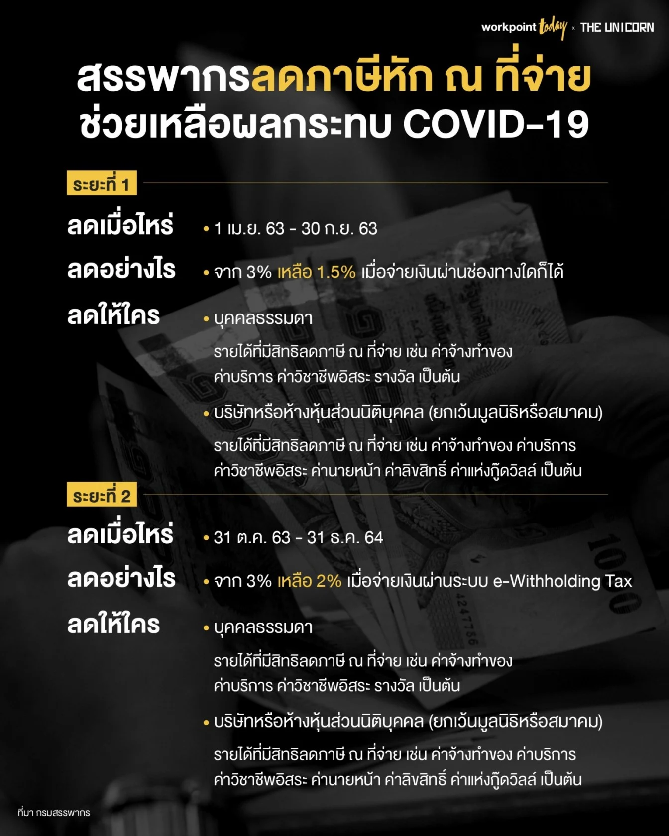 กรมสรรพากรลดอัตราภาษีหัก ณ ที่จ่าย แบ่งเป็นระยะที่ 1 (เริ่มพรุ่งนี้ 1 เม.ย. 63 – 30 ก.ย. 63) ลดอัตราภาษีหัก ณ ที่จ่าย จาก 3% เหลือ 1.5% และระยะที่ 2 (1 ต.ค. 63 – 31 ธ.ค. 64) ลดจาก 3% เหลือ 2% เพื่อช่วยเหลือประชาชนและผู้ประกอบการที่ได้รับผลกระทบทางเศรษฐกิจจาก COVID-19