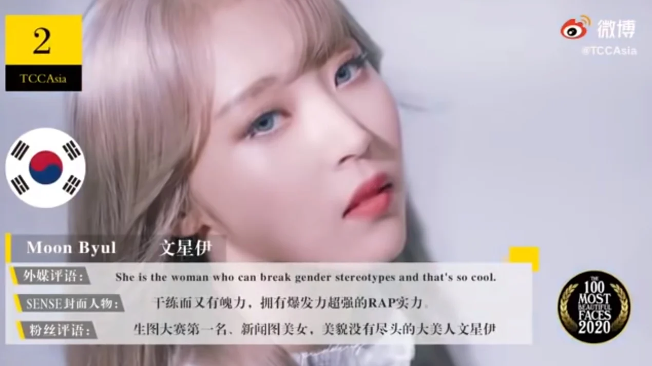 ในขณะที่อันดับ 2 ได้แก่ มุนบยอล จากวง MAMAMOO อันดับ 3 ได้แก่ แองเจล่าเบบี้ หรือ หยาง อิ่ง นักแสดงหญิงชาวจีนลูกครึ่งเยอรมัน อันดับที่ 4 ตี๋ลี่เร่อปา หรือ ดิลเรบา ดิลมูรัต นักแสดงหญิงชาวจีนเชื้อสายอุยกูร์ และอันดับที่ 5 ได้แก่เพื่อนร่วมวง BLACKPINK อย่างสาว เจนนี่ หรือ เจนนี่คิม
