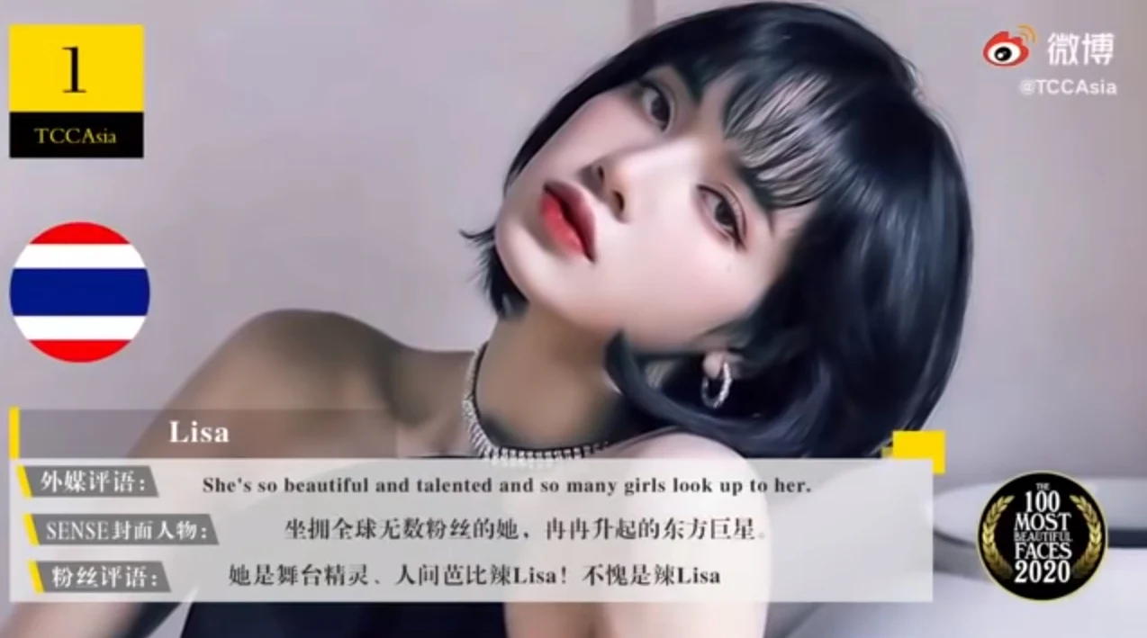 เมื่อวันที่ 2 พ.ย. 2563 TCCAsia ได้ประกาศอันดับ 100 อันดับ คนดังที่มีใบหน้าสวยที่สุดในเอเชียปี 2020 (100 most beautiful faces in Asia-Pacific 2020) โดยสาวไทยอย่าง ลิซ่า ลลิษา มโนบาล หนึ่งในสมาชิกวง BLACKPINK คว้าอันดับ 1