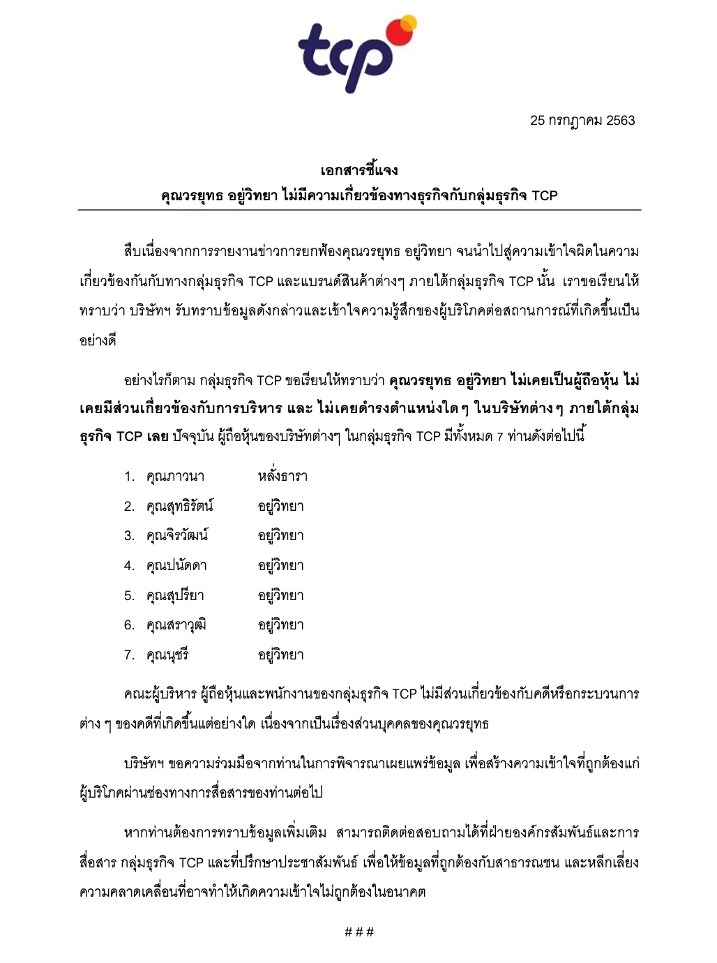 อย่างไรก็ตาม กลุ่มธุรกิจ TCP ขอเรียนให้ทราบว่า คุณวรยุทธ อยู่วิทยา ไม่เคยเป็นผู้ถือหุ้น ไม่เคยมีส่วนเกี่ยวข้องกับการบริหาร และ ไม่เคยดำรงตำแหน่งใด ๆ ในบริษัทต่าง ๆ ภายใต้กลุ่มธุรกิจ TCP เลย ปัจจุบัน ผู้ถือหุ้นของบริษัทต่างๆ ในกลุ่มธุรกิจ TCP มีทั้งหมด 7 ท่านดังต่อไปนี้