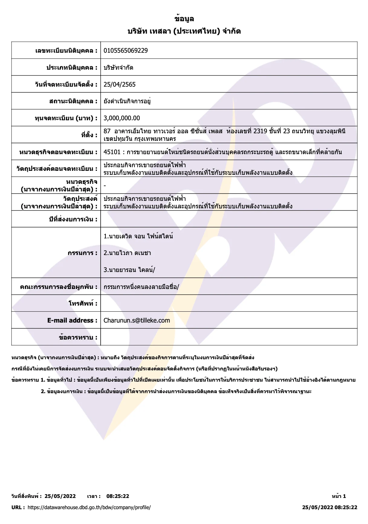 วันที่จดทะเบียนจัดตั้งคือ 25 เม.ย. 2565 ทุนจดทะเบียน 3 ล้านบาท ที่น่าสนใจคือ รายชื่อคณะกรรมการ เป็นบุคคลมีตัวตนจริง คือ