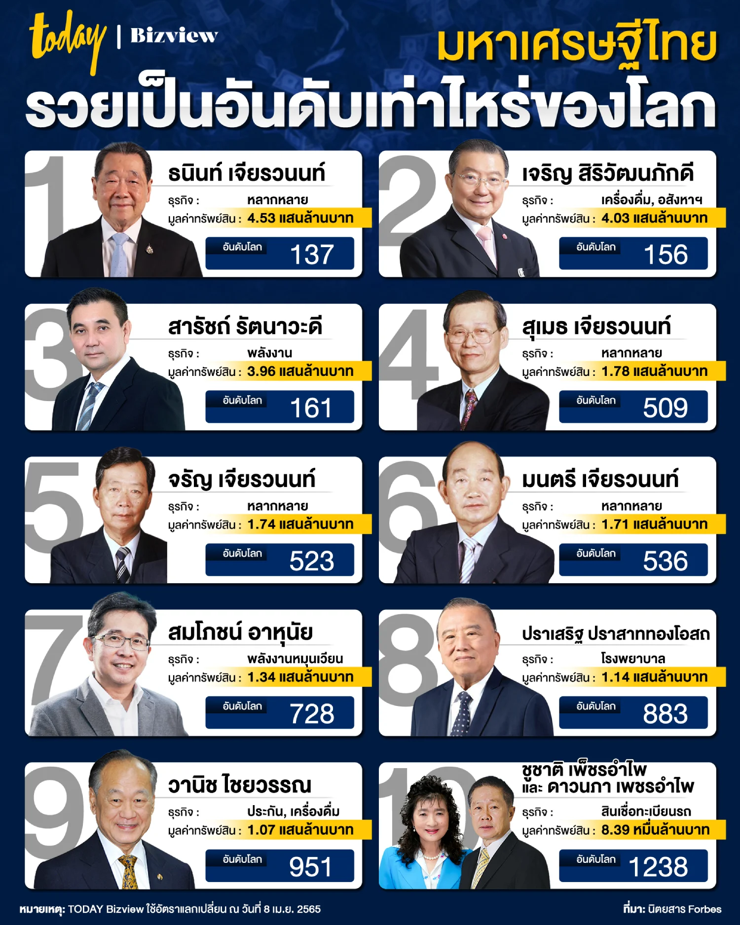 10 อันดับมหาเศรษฐีที่รวยที่สุดในไทย รวยเป็นอันดับที่เท่าไหร่ในทำเนียบมหาเศรษฐีโลกของนิตยสาร Forbes