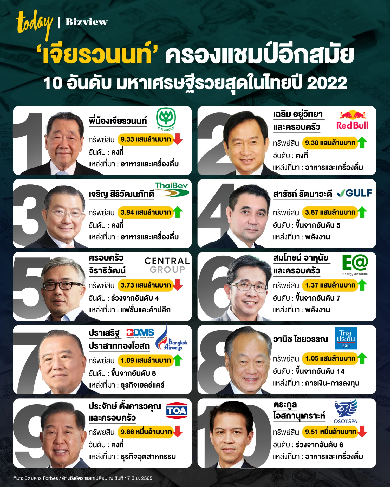 นิตยสาร Forbes จัดอันดับ 50 มหาเศรษฐีไทย ประจำปี 2022 โดยในปีนี้ ‘พี่น้องเจียรวนนท์’ แห่งเครือซีพี ยังครองแชมป์มหาเศรษฐีที่ร่ำรวยที่สุดในไทยอีกสมัยไปด้วยทรัพย์สิน 2.65 หมื่นล้านเหรียญ หรือราว 9.33 แสนล้านบาท