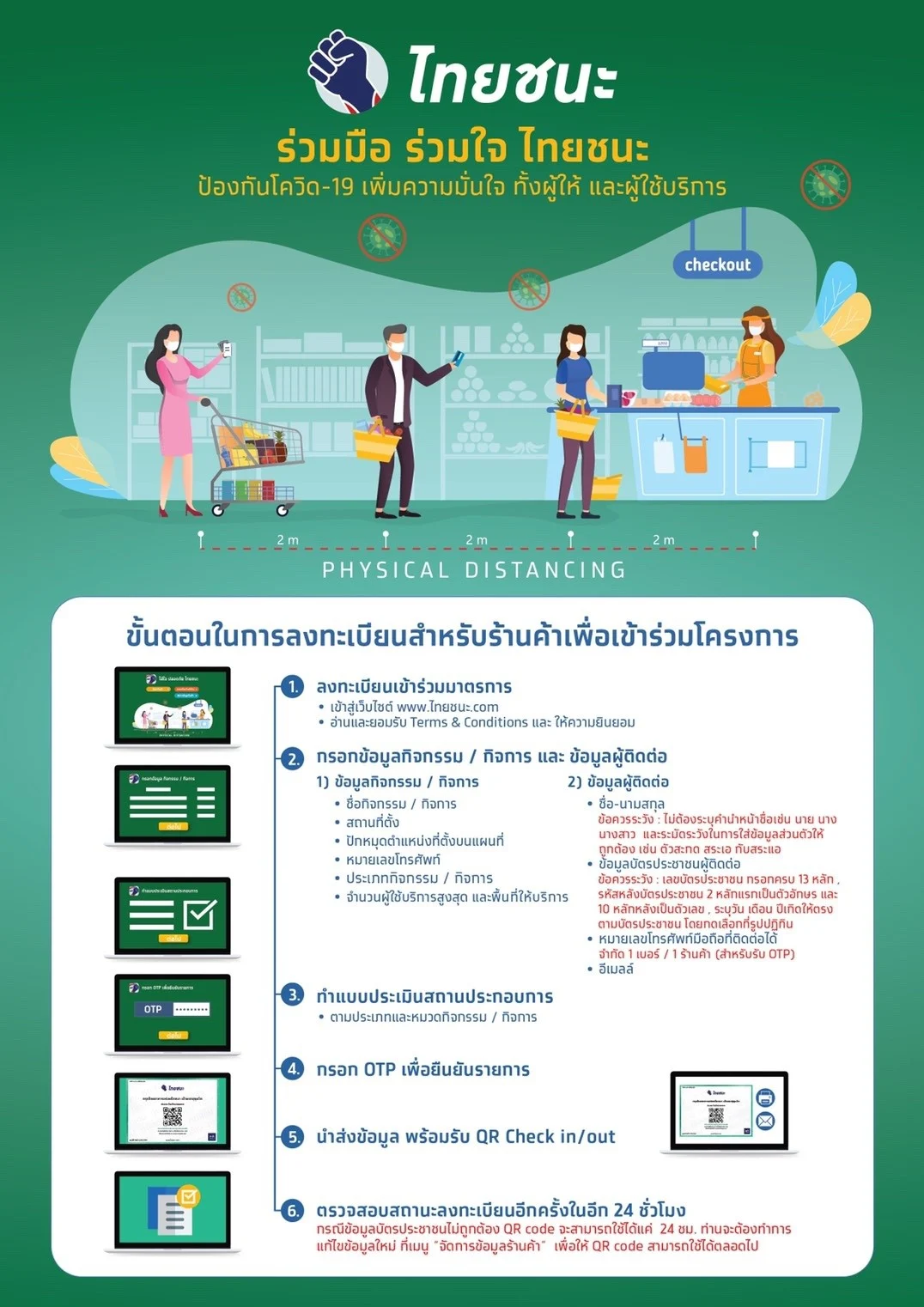 ในส่วนของผู้ประกอบการ ต้องเข้าไปลงทะเบียนที่ www.ไทยชนะ.com เพื่อรับคิวอาร์โค้ด (QR Code) นำไปแปะที่หน้าห้าง ร้าน เพื่อเป็นจุดลงทะเบียนผู้ใช้บริการ แทนการใช้สมุดจดข้อมูลลูกค้า ซึ่งเชื่อมโยงกับการควบคุมโรคของกระทรวงสาธารณสุข เปิดลงทะเบียนวันนี้ ตั้งแต่เวลา 06.00 น.