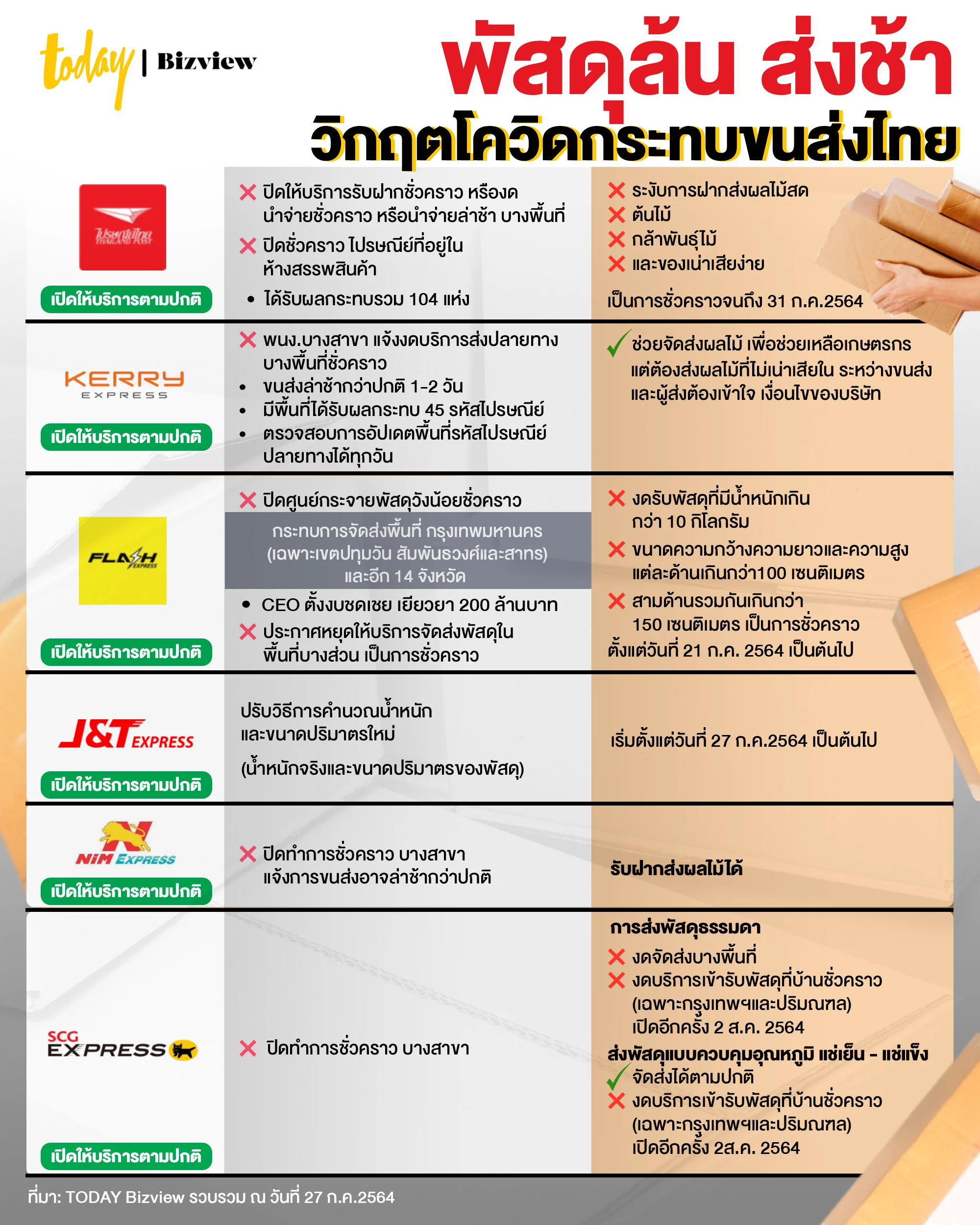 แน่นอนว่า เมื่องดการเดินทาง พบปะกัน หลีกเลี่ยงการออกจากบ้านซื้อสินค้า การสั่งสินค้าออนไลน์ รวมทั้งการส่งพัสดุฝากถึงกันแทนความห่วงใยจึงเพิ่มขึ้นตามมาเป็นอย่างมาก ย่อมทำให้ยอดพัสดุที่เพิ่มขึ้นในแต่ละวันมีจำนวนมาก จึงเกิดปัญหาการคัดแยกและการจัดส่งล่าช้าตามมา ประกอบกับปัญหาพนักงานในบางสาขา และศูนย์กระจายพัสดุของบางรายติดเชื้อโควิด-19 บางค่ายจึงถูกสั่งปิดศูนย์กระจายพัสดุ และสาขาที่ให้บริการตามๆ กันไป พบพัสดุหลายรายการได้รับความเสียหาย TODAY Bizview ได้รวบรวมผลกระทบและแนวทางการแก้ปัญหาจาก ขนส่ง 6 ค่ายหลักในประเทศไทย ไว้ดังนี้