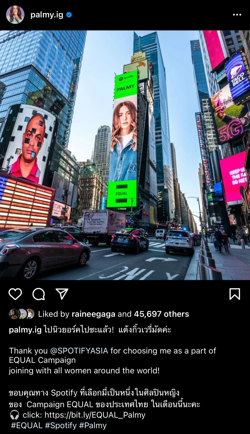 ไม่เพียงเท่านั้น ปาล์มมี่ ยังได้โพสต์ข้อความผ่านอินสตาแกรมส่วนตัว พร้อมระบุข้อความว่า “We made it to NYC!! ไปนิวยอร์กไปซะแล้ว! Thank you @SPOTIFYASIA for choosing me as a part of EQUAL Campaign joining with all women around the world! ขอบคุณทาง Spotify ที่เลือกมี่เป็นหนึ่งในศิลปินหญิงของ Campaign EQUAL ของประเทศไทย ในเดือนนี้นะคะ” ท่ามกลางเหล่าแฟนคลับที่เข้ามาคอมเมนต์กันอย่างมากมาย