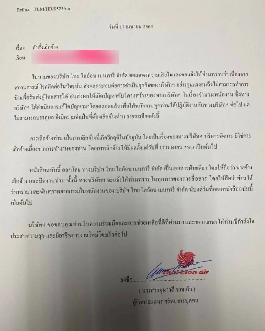 รายงานข่าวจากสายการบินไทยไลอ้อนแอร์ แจ้งถึงกรณีตามที่มีจดหมายเลิกจ้างพนักงานของสายการบินออกเป็นข่าวนั้น ไม่ได้เป็นการเลิกจ้างพนักงานทั้งหมดของสายการบินแต่อย่างใด แต่เป็นการเลิกจ้างพนักงานที่มีอายุงานไม่ถึง 1 ปี จำนวนรวมทั้งสิ้นกว่า 100 คน โดยได้มีการพูดคุยกับพนักงานกลุ่มที่จำเป็นจะต้องเลิกจ้างว่า หากสายการบินสามารถกลับมาเปิดทำการบินตามปกติได้และมีความจำเป็นจะต้องรับพนักงานเพิ่ม สายการบินจะพิจารณาพนักงานกลุ่มนี้เป็นลำดับแรก