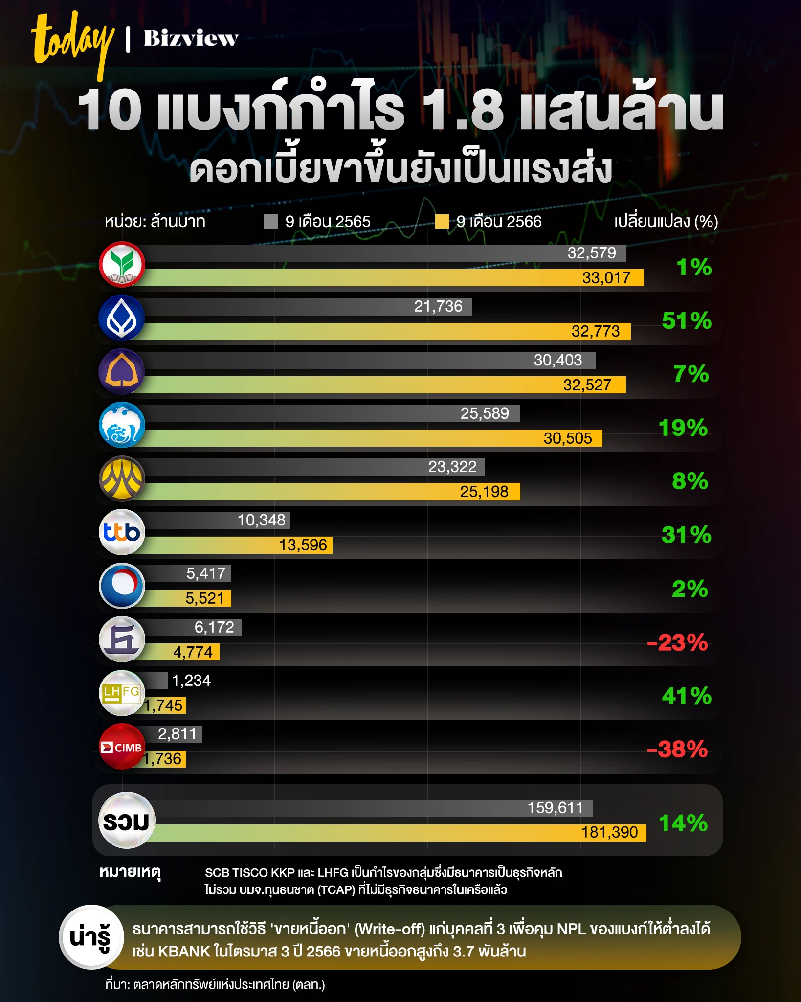 ในช่วง 9 เดือนแรกของปี 2566 ธนาคารไทยทั้งหมด 10 แห่งที่ซื้อขายอยู่ในตลาดหลักทรัพย์แห่งประเทศไทย (ตลท.) มีกำไรรวมกันกว่า 1.8 แสนล้านบาท เพิ่มขึ้น 14% เมื่อเทียบช่วงเดียวกันของปีก่อน