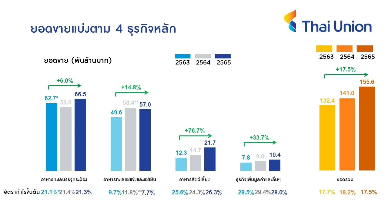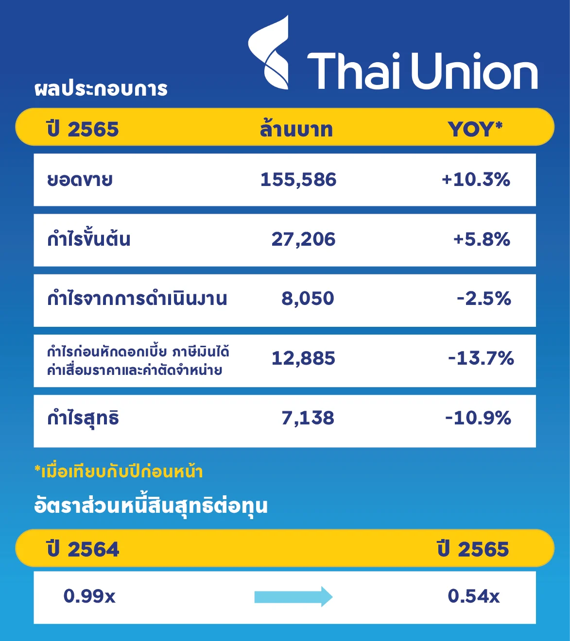 ผลงานในไตรมาสสุดท้ายของปีมียอดขาย 39,613 ล้านบาทเพิ่มขึ้น 2.9 เปอร์เซ็นต์และกำไรจากการดำเนินงาน 2,384 ล้านบาทเพิ่มขึ้น 20.6 เปอร์เซ็นต์ ส่งผลให้ไทยยูเนี่ยนเผยยอดขายตลอดปี 2565 เพิ่มขึ้น 10.3 เปอร์เซ็นต์ อยู่ที่ 155,586 ล้านบาท สูงสุดเป็นประวัติการณ์ และมีกำไรขั้นต้นอยู่ที่ 27,206 ล้านบาท เพิ่มขึ้น 5.8 เปอร์เซ็นต์เมื่อเทียบกับปีก่อนหน้า