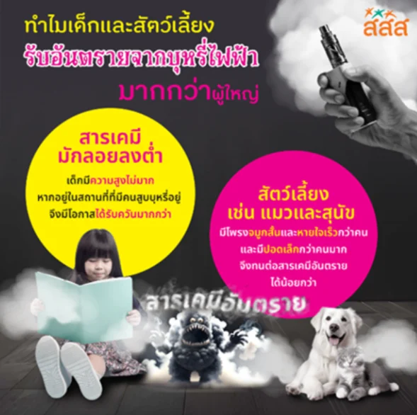 - นอกจากนี้ไอระเหยของบุหรี่ไฟฟ้า มักลอยต่ำลงสู่พื้น ซึ่งโอกาสที่สัตว์เลี้ยงแสนรัก อย่างน้องหมา น้องแมว ซึ่งมีปอดเล็กกว่าและหายใจเร็วกว่าคน จะรับเข้าไปก็เป็นไปได้ง่ายขึ้น