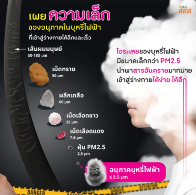 - ไอระเหย (ควัน) บุหรี่ไฟฟ้า มีขนาดเล็กกว่าฝุ่น PM 2.5 ที่กลัวกันทั้งบ้านทั้งเมือง และนำพาสารอันตรายเข้าสู่เม็ดเลือดแดงได้เร็วแค่ 20 วินาที