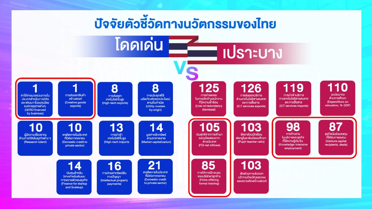 แต่ยังมีตัวชี้วัดด้านการวิจัยและพัฒนา (R&D) ของประเทศที่อันดับดีขึ้นอย่างต่อเนื่อง โดยเฉพาะสัดส่วนค่าใช้จ่ายมวลรวมภายในประเทศสำหรับการวิจัยและพัฒนา อยู่อันดับที่ 36 ซึ่งเป็นจุดแข็งของประเทศไทยในระดับกลุ่มประเทศรายได้ปานกลางระดับบน