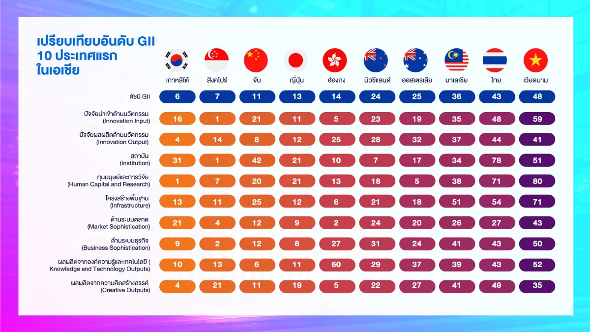 สำหรับผลการจัดอันดับความสามารถทางด้านนวัตกรรมในปีนี้ ประเทศไทยอยู่อันดับที่ 43 โดยในปีนี้ปัจจัยย่อยผลผลิตทางนวัตกรรม (Innovation output sub-index) อยู่ในอันดับที่ 44 (ดีขึ้น 2 อันดับ) ขณะที่ฝั่งปัจจัยเข้าทางนวัตกรรม (Innovation input sub-index) อยู่ในอันดับที่ 48 (ลดลง 1 อันดับ) แต่ยังคงอยู่ในอันดับ 5 ของกลุ่มประเทศกลุ่มรายได้ปานกลางระดับบน (Upper middle-income economies) จาก 36 ประเทศ