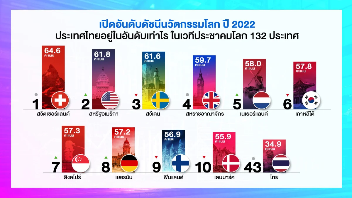 โดยในปีนี้ประเทศไทยยังครองอันดับที่ 43 (ปี 2021 อันดับ 43) ถือเป็นอันดับ 3 ในอาเซียนรองจากสิงคโปร์ อันดับ 7 และมาเลเซีย อันดับ 36 โดยปัจจัยสัดส่วนค่าใช้จ่ายมวลรวมด้านวิจัยและพัฒนาที่ลงทุนโดยองค์กรธุรกิจ และปัจจัยสัดส่วนการส่งออกสินค้าสร้างสรรค์เป็นอันดับ 1 ของโลก