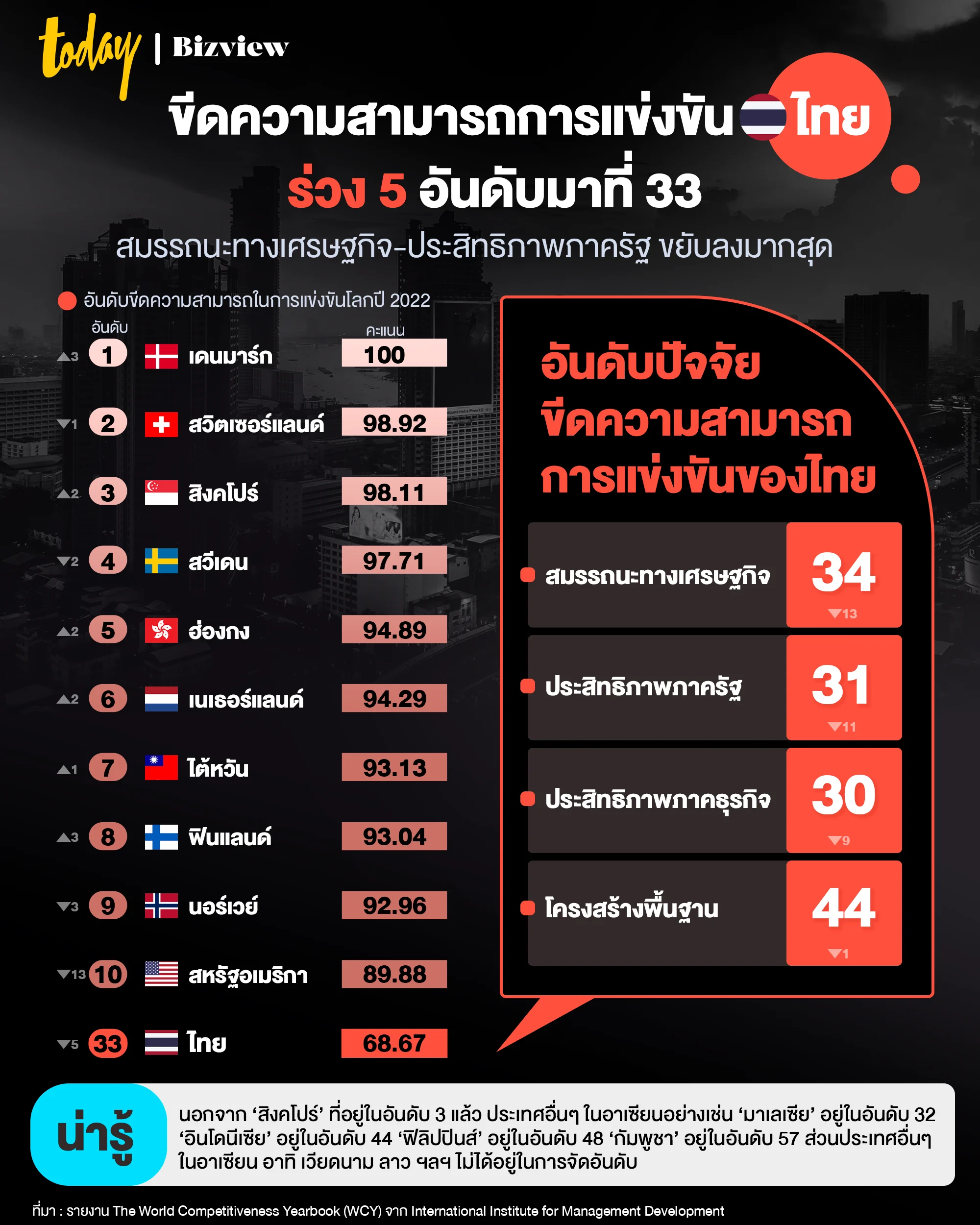 ขีดความสามารถการแข่งขัน ‘ไทย’ ร่วง 5 อันดับจากปีก่อน มาอยู่อันดับ 33 ปัจจัยด้าน ‘สมรรถนะทางเศรษฐกิจ-ประสิทธิภาพภาครัฐ’ ขยับลงมากสุด