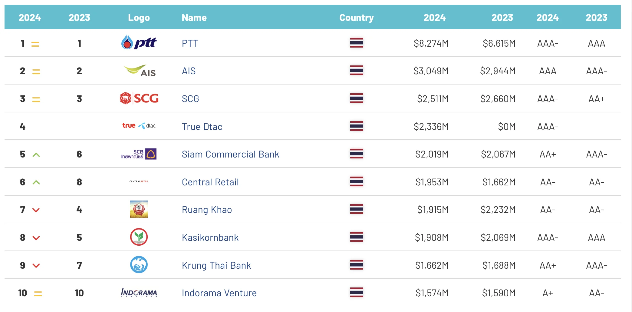Brand Finance บริษัทที่ปรึกษาด้านกลยุทธ์และการประเมินมูลค่าแบรนด์ชั้นนำของโลก ได้เผยแพร่รายงาน Brand Finance Thailand 50 ประจำปี 2567 ซึ่งจัดอันดับ 50 แบรนด์ไทยที่มีมูลค่ามากที่สุดในปีนี้