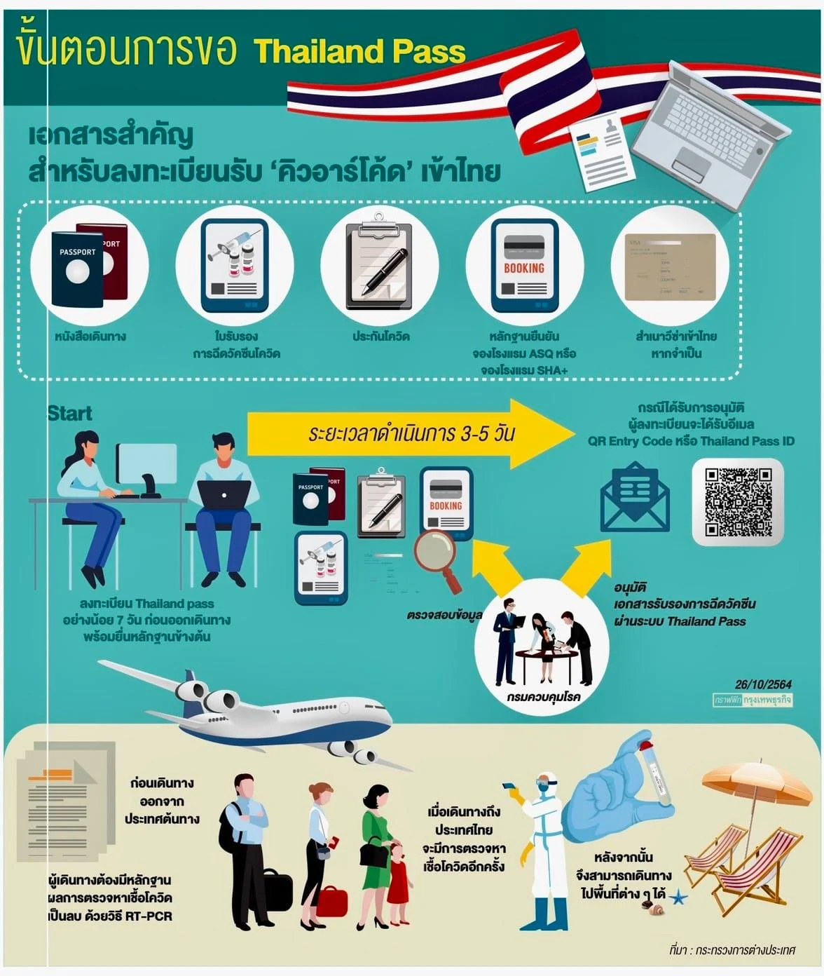 1. ตั้งแต่วันที่ 1 พ.ย. 2564 เป็นต้นไป ผู้ประสงค์เดินทางเข้าไทยสามารถลงทะเบียนในระบบ “Thailand Pass” ออนไลน์ ได้ที่ https://tp.consular.go.th/ ซึ่งผู้ลงทะเบียนในระบบใหม่จะได้รับ Thailand Pass QR Code เพื่อใช้แสดงต่อสายการบิน และเจ้าหน้าที่คัดกรอง ณ ด่านตรวจคนเข้าเมือง